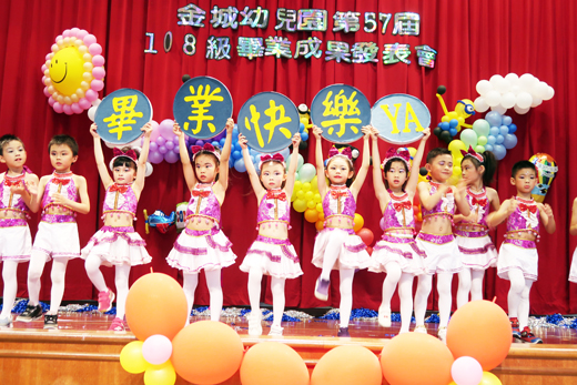 迎接畢業季的到來,金城幼兒園先在日昨舉行大班成果發表會,會場吸引了許多的家長來觀賞自己孩子的演出。家長們對於自家寶貝們在舞台上的表現感動不已,紛紛拿起相機錄影,見證孩子們的成長。 今年金城幼兒園成果發表會的演出節目有:大桔班—動感Boom! Boom! Boom、大紅班—躍動青春、大綠班—綠光森林、太陽班—歡樂舞曲、大粉紅班—韓風來襲.勁歌爵士、大藍班—-戰士與舞孃、大紫班—東方舞韻.鼓聲現舞蹤、大黃班—舞動啦啦,節目精采多元,活力十足,在場的歡呼聲、掌聲不斷。 每年城幼的大班畢業成果發表總是吸引許多家長的觀賞,這是孩子們幼兒階段的最後一次上台表演,各班老師更是絞盡腦汁設計表演活動內容,節目精彩內容多元,道具與服裝更是不可少,而小小表演者認真、可愛的表演,更是不輸專業的表演者,孩子的表現讓台下的家長忙著拿起手上相機與手機不停地拍照、錄影,深怕遺漏掉任何一個珍貴畫面。 城幼園長許碧華表示,在期末畢業前舉辦成果發表會,由畢業班的幼兒上台輪番表演,主要目的是讓家長了解小朋友在幼兒園中學習的課程,並藉由團體合作的表演,展現多元的學習成果及能力,讓幼兒獲得成就感與自信心,給孩子留下成長中最寶貴、最難忘的經驗和回憶,也期望透過成果發表,讓親、師、生齊聚一堂,相互觀摩與情感交流。