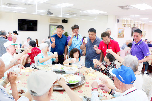 圖文/楊水詠 大同之家昨日中午辦理「一○八年端午節聯誼餐會」活動,縣政府社會處處長董燊、金城鎮鎮長李誠智、金寧鄉鄉長楊忠俊等人到場參加,與大同之家長者同歡共樂,祝福老人家端節平安、健康呷百二。同時,社會處長董燊指出,縣長楊鎮浯很注重老人的福利及落實社會福利政策,給予長者完善照顧是縣府重要施政目標,未來將會持續落實更完善的長期照顧服務體系,讓每一位長輩都可活得健康及尊嚴。