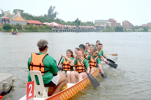 圖文/許加泰 金門外籍教師組隊參加第十一屆端午節龍舟競賽,雖然成績不理想,外籍教師直說「太好玩,太有趣了」。 金門縣政府教育處和Fulbright學術交流基金會合作,遴選一批具有教育服務熱忱、品德良好的美國畢業生到金門服務,與金門學童建立了課堂上以及生活上的情感。 二十多位外籍教師組Rowin Dirty、Seas the Day兩隊參賽,外師下水操槳,因經驗不足,偏離軌道,但大夥還是很努力划回終點。外師說,端午有划龍舟吃粽子的習俗,獲悉可以參加金門龍舟競賽,大夥相招報名,要親身體驗划龍舟的快感。 外師說,划龍舟也是不容易的事,隊友要有相當好的默契,划水的動作與速度要一致才能全速前進,練習時雖然很操但很有成就感。
