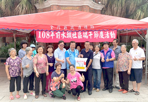 慶祝端午佳節到來,許多社區都辦理端午節慶祝活動,金城鎮前水頭社區發展協會理事長黃延良里長,帶領社區志工媽媽們一起動手包肉粽分給社區居民享用,並送社區關懷據點獨居老人與附近單位,同時走訪大同之家等社福機構探慰弱勢,致贈味美新鮮的肉粽,向他們賀節,歡度過了一個充實溫馨的端午佳節。 金城鎮前水頭社區展開歡慶端午節活動,在社區發展協會理事長黃延良(金水里里長)的帶領下,於社區活動中心舉行包粽慶端午活動;縣府社會處長董燊、金城鎮長李誠智、立委陳玉珍、鎮代表翁沂杰等人也到場向鄉親賀節,和鄉親一起感受端午節的熱鬧溫馨氣氛。 前水頭社區慶祝端午佳節到來,自五日開始一連三天,社區協會的理監事與社區志工媽媽們齊聚一堂,以傳統的手法包製肉粽,大家分工合作,準備各項配料,炒熟香菇、蝦米,栗子,再以粽葉將滷肉、蛋等起包入後蒸煮,一串串完成後的粽子,香味四溢,充滿著端午節的歡樂氣氛。 一連三天來製作完成的粽子,除了送社區家戶享用,並送社區照顧關懷據點、獨居老人與附近公家單位一起分享,同時理事長黃延良也與社區代表帶著香噴噴的肉粽前往大同之家、晨光教養家園、松柏園探慰弱勢鄉親向他們賀節。 黃延良里長表示,該會妥善運用地方回饋金於地方事務以及配合節慶辦理活動,增添活動的熱鬧氣氛。也感謝該協會理監事和志工的付出心力,投入社區的活動。