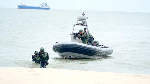 國軍年度漢光演習從二十七日開始進行為期五天的攻防演練,金門兩棲營海龍蛙兵昨日執行特攻突擊作戰演練,進行滲透突擊作戰任務,以快艇與隊員高超戰技,展現前線駐軍平時訓練的成果。 金門兩棲營昨日是以模擬實戰中重要目標遭敵佔領後建立通信指揮設施為想定,負有癱瘓敵軍指揮中樞,以策應友軍作戰任務之目的,重點在於「海上滲透,岸際接敵,目標突擊,特種爆破與敵火下撤離」。 營部連少校連長徐昆德表示,兩棲特種作戰是未來防衛作戰一環,昨日演練在於驗證突擊快艇在海上滲透及運用突擊快艇海上機槍火力掩護官兵撤退,以驗證官兵作戰基礎。 而昨日演練狀況分為三個階段:第一階段為水域滲透及岸際滲透接敵,(演練課目為:斥候偵察導引,快艇搶灘登陸,岸際滲透與巡邏小組襲殺);第二階段為目標突擊與破壞,(操演課目為:特種爆破,小部隊戰鬥與指揮,絕壁攀降);第三階段為敵火下撤離,(操演課目為:阻敵增援小部隊隊形運用,快艇接應撤離)。 而昨日的演練,是首次以開闊南海面沙岸地形直接搶灘登陸,除考驗兩棲官兵能否嫻熟運用戰術動作以及破壞能力外,野外也必須克服戰場環境下相互通聯指揮的受限,才能有效達成上級交付的命令。