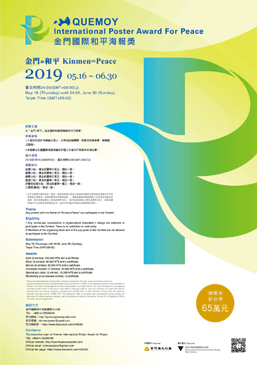 今年是古寧頭戰役70週年,金門縣文化局於2018年辦理「金門國際和平海報獎」,在海內外獲得相當大的迴響,有19個國家地區、1331件優秀作品參與競賽。今年再度發出總獎金新台幣65萬元舉辦「2019金門國際和平海報獎」徵件,徵件時間自5月16日(四)起至6月30日(日)截止,採線上報名方式,年齡資格不限、免繳報名費用,歡迎國內外好手踴躍報名投遞作品參加競賽。 金門縣文化局強調,用高額獎金,向國際設計達人徵件,廣邀國內外設計好手一起來挑戰拿獎金。期望用和平海報行銷金門,發揮金門的軟實力! 文化局表示,2019年是古寧頭戰役70週年,金門早期處於戰火連天的險境,依然挺立於海峽兩岸,成為了全球人類追求和平的最佳見證,文化局舉辦「金門國際和平海報獎」,希望建立「金門=和平」的形象,誠摯邀請全球對此項活動有興趣的民眾熱情參與,讓世界看見金門。 文化局指出,競賽主題:以「金門=和平」為主題的相關海報創作均可參賽。參賽資格:1.凡是對於設計有興趣之個人、公司或組織團體,皆歡迎投稿參賽,無國籍之限制。2.本競賽之計畫團隊成員與擔任評選工作者均不得參與本項比賽。3. 凡參與2018年金門國際和平海報獎獲得金、銀、銅、優選及評審特別獎及入圍(包含)之作品,該作品不得再報名參加本競賽。 報名方式:請以官網進行網路報名https://quemoypeaceposter.com/,及提交個人或團體資料、作品圖檔與著作授權同意書檔案。參賽者不需另外投遞紙本作品及光碟檔,所有參賽作品將由執行單位統一列印進行評選。作品規格:1.參賽作品數量不限,可以單一作品或系列作品,每個系列作品最多以四張為限、不限創作年份。2.參賽作品檔案格式:A2尺寸、20MB、JPG檔、300dpi。 本活動自5月16日起開始受理報名徵件,至6月30日截止。金獎(2名)可獲得新台幣10萬元及獎狀一紙;銀獎(3名)新台幣6萬元獎金及獎狀一紙;銅獎(5名)新台幣3萬元獎金及獎狀一紙;優選(7名)新台幣1萬元獎金及獎狀一紙;評審特別獎(5名)新台幣1萬元獎金及獎狀一紙;入圍獎(數名)可獲獎狀一紙。8月初公布得獎名單。獲獎作品8月至9月在北中南巡迴展出。此外,金、銀、銅獎之獲獎者將受邀出席8月臺北記者會及10月金門展覽開幕會。徵件活動相關規定請參閱官方網站:https://quemoypeaceposter.com/。