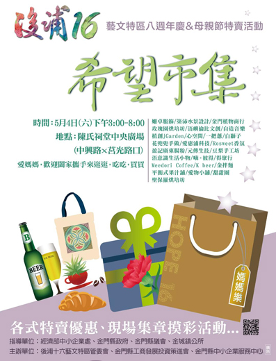 「後浦十六藝文特區」將在五月四日(文藝節)下午三時起至八時止,於陳氏宗祠廣場舉辦「希望市集」活動,歡迎鄉親帶著輕鬆的心情與家人前往藝文特區共襄盛舉,來趟尋寶之旅並提前備好母親節禮物,感謝媽咪。 在經濟部中小企業處、金門縣政府、金門縣議會、金城鎮公所指導下,金門縣工商發展投資策進會、金門縣中小企業服務中心、後浦十六藝文特區管委會希望延續去年市集集客活動「集戳章、摸大獎」盛況,共同辦理這場希望市集活動。 後浦十六藝文特區是金城鎮城區內一個饒富傳統閩南建築之美及文創氣息濃厚的觀光景點,藝文特區內的店家匯集眾多青年學子的創意、設計及手工作品;本次「希望市集」邀請特區內品牌女裝「姍卓服飾」、水景設計「築沛水景設計」、文創商品「金門植物商行」、手作麵包&茶飲「玫瑰園烘焙坊」、復古花磚「浯嶼倫比文化事業」、樂器&音樂製作教學「自造音樂」、多肉植物&植栽禮品&日雜花器「植創美學設計工作室」、瑜珈&占卜「心空間」、手工皂&手繪明信片「一把蔥雜燴工作室」、啤酒&雞尾酒「白獅子酒吧」。外部攤商則有在地鮮奶冰淇淋「平衡式果汁舖 Balance」、現烤酥皮甜甜圈「糖圈圈」;嬰兒圍兜「花兜兜手作」、天然大豆蠟燭「Rosweet Studio香氛工作室」、手做龜苓膏「盈記廣東腸粉」、高粱酒醋「元傳生物科技企業社」、手工布包「豆梨手工坊」、雷雕文創生活小物品「浯意識生活小物」、無框畫「嗨‧彼得」、氣泡飲「Meedori Coffee」、神風獅啤酒「K beer 金門精釀」、玉飾品、「得聚行」、空氣過濾「愛惠浦科技」;提袋拌麵、「金拌麵」、二手衣物、「愛物小舖」、手工點心「聖保羅烘焙坊」等眾多優質商品。 為了吸引更多的鄉親和旅客來參與活動,主辦單位特別印製戳章卡,凡到藝文特區店家、市集攤商任三家消費(不限金額),即可要求商家蓋戳章,蓋好三個戳章即可參加摸彩,精美獎品由主辦單位提供,將有超過百份驚喜大獎,抽完為止。 位於金城鎮莒光路以及中興路的十字交叉路口處,就是當地人所稱的「後浦十六藝文特區」,早年的金城後浦小鎮,其熱鬧和繁榮的景象,甚至不亞於現今的西門町,當時人潮景況可謂是車水馬龍;但是隨著金城鎮商圈逐漸往外發展的趨勢下,人潮擁擠的榮景也漸漸流失,因此金門縣工商發展投資策進會、金門縣中小企業服務中心與藝文特區管委會為了再度創造後浦商圈的繁華人潮,希望能夠藉由「希望市集」活動的舉辦,讓民眾重溫兒時舊夢,促使城區可以更加繁榮起來。