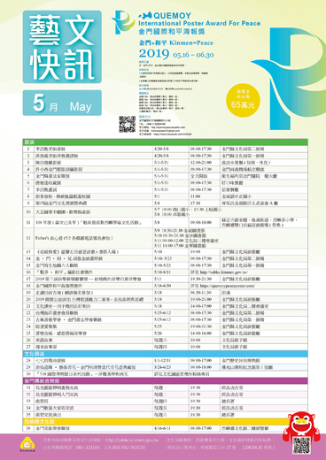 步入初夏的五月,讓我們持續地以音樂、繪畫、攝影等藝術,豐富生命裡的色彩。時值感恩的五月,文化局請鄉親一起來,以具體行動對辛苦的母親們道聲謝謝,一起來參加文化局的活動吧! 這個月有著第四屆金門文化獎頒獎典禮,4日下午17:30,典禮將假昇恆昌金湖飯店太武宴會A廳舉行,今年有翁文林、沈富春、洪啟義、陳素民、林馬騰五位得獎人,謝謝他們持久不輟的創作及對傳統文化的傳承。魁星爺今年將巡點烈嶼學區,8日從奎閣出發,沿途經後浦街道,然後至烈嶼各中小學給學童稜轎腳,讓他們祈求學業進步、考試順利,最後到雙口拱福宮前廣場舉行祭典。 戰火無情,和平無價!今年值古寧頭戰役七十周年,用創作來為這前人瀝血得來的和平下個發人省思的註腳。金門國際和平海報獎徵件,5月16起至6月30日止;「戰爭.和平」攝影比賽徵件,5月10日起至8月31日止,歡迎民眾踴躍投件。 推廣傳統藝術,繼四月的「指掌春秋—傳統傀儡戲進校園」之後,本月將請高雄天宏園掌中劇團至烈嶼鄉的三所國小巡迴演出,「歡樂偶童節」7日上午10:00西口國小、7日下午13:30上岐國小、8日上午10:00卓環國小演出,同學們一起來看戲吧。另外,邀請鄉親「作伙廟口看好戲」,11日在浯島城隍廟由金鷹閣電視木偶劇團演出「戲說打狗」,12日則由台北木偶劇團演出「茶山風雲」,13日在北鎮廟由昇平五洲團演出「孟良盜馬」,趁著浯島城隍遷治339年的活動期間,和眾人一起到廟口看熱鬧吧。 「花帔阿獺」來囉,10日晚間19:00,邀請地區弱勢家庭、新住民家庭、新手父母等民眾一同觀賞,並將請到以臺灣首部3D立體動畫「桃蛙源記」揚名中國大陸的臺灣導演楊仁賢蒞金分享及互動交流,藉由花帔傳達出對母親及長輩照護與養育感恩之心,由影片主題讓親子在奇幻的想像中學會故事所傳遞的「珍惜」真諦。在母親節這樣的日子,請「Father's表心意」吧,親手製作花束送給媽媽,9日18:30-21:30金湖圖書館,10日18:30-21:30金沙圖書館,11日09:00-12:00文化局三樓會議室,11日14:00-17:00金寧圖書館,四場次活動各招收40人,2日起接受電話報名。 文化局展場在五月有三個展覽檔期,數十年來書藝不輟,甫獲得文化獎的「洪啟義老師書藝邀請展」,8日前文化局第一展場;驅山走海到處寫生,最近積極尋求畫風多變的「李苡甄老師畫展」,8日前文化局第二展場展出。「金門寫生地圖水彩畫展」,10日至23日,金門縣文化局第一展場,展出洪東標、楊天澤、姚植傑、陳俊男、曾己議、吳冠德六位畫家在金門的寫生足跡;「金門相見—胡復金油畫特展」,10日至23日,文化局第二展場。「古風書藝學會‧金門書法學會聯展」,5月25日至6月12日,文化局第一展場;「台灣海洋畫會會員聯展」,5月25日至6月12日,文化局第二展場。 五月的週六夜晚都有著美妙的音樂饗宴可聽,「2019第三屆浯樂新聲獻馨情~給媽媽的音樂百匯音樂會」,11日晚間19:30-21:30,假文化局演藝廳演出。2019創價公益演出「台灣歌謠魅力二重奏~金馬澎經典巡禮」,18日晚間19:00-21:00,文化局演藝廳。「盼望愛樂集」,25日晚間19:00-21:30,文化局演藝廳演出。「愛戀金城·感恩惜福音樂會」,26日下午14:00-16:00,文化局演藝廳演出。 「走讀田浦古城」,18日上午08:30-11:30在田浦由專人帶領解說,看看1387年迄今的古城田浦,看看歷史的痕跡,聽聽過往的故事;欲參加本活動請網路報名。「文化講座│用手機拍出好相片」,18日下午14:00-17:00,假文化局三樓會議室,由手機攝影達人周麗紅分享手機拍照的小訣竅,讓你我隨手拍出好照片;公務人員全程參加者,可得終身學習時數3小時。 「七七抗戰油畫展」於文化園區全年展出。「浯島瓷輝‧藝韻青花-金門明清暨當代青花瓷典藏展」,3月24日起至6月23日,假高雄佛光山佛陀紀念館第1展廳展出金門文化園區70件青花瓷館藏。「518國際博物館日-洋樓修護及再利用工作坊」,喚起對金門在地洋樓的重視,邀請你我一起尋求老建築的再生之路,詳見文化園區管理所粉絲專頁。烈嶼鄉文化館二樓展覽廳現正展出「金門美術學會聯展」,展期自4月16日至6月11日,到烈嶼時也請到文化館看看吧,館內不只陳列藝術作品,也呈現金門先民的歷史器物。 藝術離生活不遠,金門縣除文化局展覽廳、烈嶼文化館、文化園區等處作為藝術表演的場地,另外假機場航空藝廊等處展出藝術家的作品。「陳自強攝影展」,湶民水果餐;「許小西金門藍眼淚攝影展」,金門尚義機場航空藝廊;「金門縣書法家聯展」,衛生福利部金門醫院一樓大廳;「唐敏達收藏展」,好口味餐廳;「李苡甄畫展」,信源餐廳。 每週六、日上午10:00,歡迎親子一起到文化局親子館聽故事、玩遊戲、學外語,週六美語故事、周日周末故事屋,現在還多了法文喔。金門傳統音樂館,每周一至周六的晚間19:30都開課(週三除外),烏克麗麗彈唱進階交流(每周一)、烏克麗麗彈唱入門交流(每周二)、金門歌謠大家唱交流(每周五),於邱良功古厝開課;總兵署,南管班(每周四)、南管音樂演出(每周六),於總兵署開課。