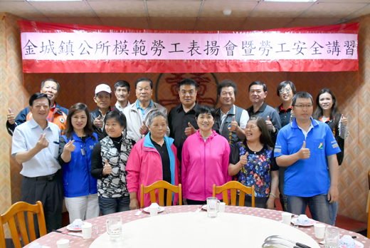 金城鎮公所為了表揚勞工的辛苦,於昨(一)日晚間六時,於白玉樓餐廳辦理模範勞工表揚,並進行年度職業安全教育訓練。 金城鎮公所的「模範勞工表揚與職業安全教育訓練活動」,於昨日下午六時在白玉樓餐廳舉行,由鎮長李誠智主持,縣府社會處長董燊、金城鎮民代表會主席陳天成、環保局科長,以及多位鎮代及里長到場,向公所人員致意,計有員工近二百人與會。 金城鎮長李誠智首先感謝勞工朋友們,感謝他們在職場上堅守崗位的辛勞,並向積極奉獻的勞工朋友們致上由衷的謝意及敬意,期勉他們能繼續抱持誠懇、積極的態度,為民服務。 會中並由李誠智親自頒獎表揚模範勞工,經幹部推荐和複核評選的結果,今年度金城鎮公所獲獎的模範勞工,計有陳碧月、方保鳳、黃文良、翁秀治、楊龍傑、梁惠嬌、吳增祥等七人。