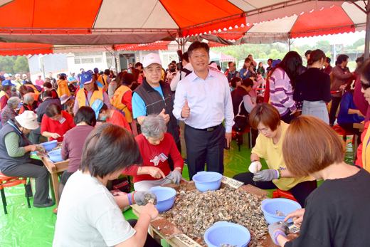 金門「2019石蚵小麥文化季」活動重頭戲「千人剝蚵體驗」,昨日下午在金寧鄉北山海堤盛大登場,縣長楊鎮浯、金寧鄉長楊忠俊、金城鎮長李誠智等人從蚵田挑上石蚵,為活動拉開序幕。來自全島各地一千二百多位男女老少在長條棧板上手起刀落剝蚵,也有老外及觀光客首次體驗剝蚵,二小時不到剖完六千公斤帶殼新鮮石蚵,民眾也開心分享豐收的喜悅,將辛苦採好海蚵帶回家嚐鮮,大家也相約明年再來。 這項由金寧鄉公所主辦的石蚵小麥文化季已邁入第十六年,每年活動中的重頭戲就是「千人剝蚵」了。金寧鄉公所每年都準備六千公斤的帶殼新鮮石蚵來舉辦這項活動,工作人員二天前就向古寧頭地區的蚵民收購,並動用清潔隊人力運往水試所放置保鮮,待活動時再運到現場,讓民眾體驗剝蚵。 昨日活動共有來自全島各地及觀光客,有超過一千二百多人參加,於下午三時卅分齊聚北山出海口兩側海堤,約兩百多公尺的海堤擠滿超過一千二百多人,場面相當浩大。現場活動中,有來自廈門觀光客、旅台鄉親以及老外到場體驗。 縣長楊鎮浯、金寧鄉長楊忠俊、金城鎮長李誠智、鄉代表李琳瑯、古寧村長李開陣等人各挑著石蚵從蚵田步道挑上岸,金門縣公揹婆民俗協會及鳳翔社區跑旱船也到場表演農村曲、青蚵嫂,讓活動增添幾許熱鬧氣氛。 縣長楊鎮浯偕金寧鄉長楊忠俊賢伉儷、金城鎮長李誠智及縣府觀光處長丁健剛等人從灘岸挑蚵擔進場,與鄉親一起體驗剖蚵的辛勞。楊鎮浯表示,一路從斜坡吃力挑上岸,初體驗挑蚵感覺有點喘,可以想見蚵民挑著重擔走過泥濘的漫長「海路」,上岸後還要小心翼翼剖殼取肉,才能成為餐桌上的美味佳餚,可說是「粒粒皆辛苦!」 楊鎮浯等人在剖蚵高手李開陣村長的現場指導下,知道剝蚵要從蚵眼下刀,一會功夫慢慢順手,看到經驗老到的民眾刀起刀落在棧板上施展真功夫,不到半小時就滿滿一大盆,讓初體驗者望塵莫及直說:「九十幾歲的阿嬤好厲害喔!」