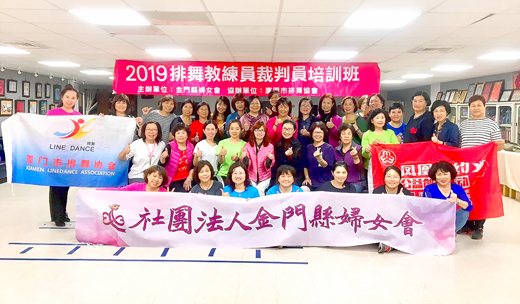 由金門縣婦女會主辦,廈門市排舞協會協辦之「2019排舞教練員裁判員培訓班」一連三天假金門舉辦,來自廈門市排舞協會杜薇、李萍、李秀英等三位專業教練抵金指導,金門縣婦女會各鄉鎮分會共計50人參訓,並取得結業證書,待考試通過後將可成為教練。 金門縣婦女會理事長王秀玉表示,期許兩門透過排舞(陸稱廣場舞)深化交流,舞出青春、舞出活力! 「2019排舞教練員裁判員培訓班」一連三天假金門舉辦,金門縣婦女會五鄉鎮分會分別派十人參訓,總計五十人與會。活動由廈門市排舞協會副會長杜薇(排舞導師級教練、國際裁判員)、廈門市排舞協會培訓部主任李萍(華僑大學教師、排舞導師級教練、國際級裁判員)、廈門市排舞協會副會長李秀英(排舞級教練員、一級裁判員)等蒞金指導,帶領學員展開3天密集且充實的訓練,內容包括,排舞基本理論、技巧、五首歌曲舞步教學等,也進行分組報告並於最後舉行結業式,圓滿劃下句點。 金門縣婦女會理事長王秀玉表示,今年開辦「2019排舞教練員裁判員培訓班」並邀請到廈門市排舞協會三位專業教練抵金指導,機會難得,而兩門(金門與廈門)門對門,彼此藉舞蹈、文化或宗教等友好往來,過去曾於104年在前理事長許華玉帶領下組團到廈門參加由婦女聯合會舉辦的排舞交流,今年3月金門縣婦女會也赴廈參與排舞交流,皆獲得不錯成績。 王秀玉也指出,排舞在大陸稱作廣場舞,現在於世界各地相當流行,也是一種共同的語言,只要音樂一下,全世界的舞者都能跟著舞動肢體,故希望藉此次培訓課程,促進兩會交流;也鼓勵取得結訓的學員,經過考試取得教練及裁判員資格,未來成為婦女會的排舞種子,向外傳播,讓更多婦女朋友走出來跳舞,大家一起舞出青春、舞出活力!