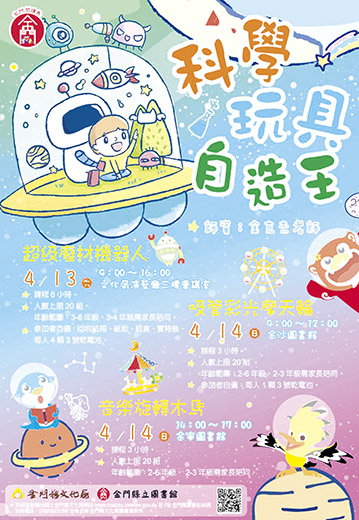 想自己動手做一個玩具,卻不曉得該如何著手?買了模型回家組,卻不知道要用什麼工具?金門縣文化局推動金門閱讀島,辦理「家有小創客-科學玩具自造王」閱讀推廣活動,今將於文化局親子館、金寧圖書館、金沙圖書館上班時間(上午9:00至17:30)受理現場報名,有興趣的小朋友需現場借書10本,方可報名,額滿為止,歡迎符合資格之小朋友報名參加活動。 本活動共有3場次,舉辦時間及地點訂在:4月13日上午09:00~16:00於金門縣文化局演藝廳三樓會議室辦理;4月14日上午09:00~12:00在金沙圖書館辦理;4月14日下午14:00~17:00於金寧圖書館辦理;每梯次各招收20人,並請參與活動者提前20分鐘報到。 第一場將於文化局舉行將做「超級廢材機器人」,課程6小時。年齡範圍3│6年級學生,3│4年級需家長陪同。參加者請自備回收紙箱、紙板、鞋盒、寶特瓶、每人4顆3號乾電池。第二場於金沙圖書館舉行將DIY「吸管彩光摩天輪」,課程3小時,年齡範圍:2│6年級,2│3年級需家長陪同。參加者自備:每人1顆3號乾電池。第三場於金寧圖書館舉行製作「音樂旋轉木馬」,課程3小時。年齡範圍:2│6年級,2│3年級需家長陪同。 文化局指出,利用生活常見的素材,打造有趣的玩具。留意生活周遭,處處皆有驚喜,不斷從生活中尋找靈感,也是最希望讓大眾了解的事。玩樂是孩子最喜歡、成效最好的學習方式,經由父母陪伴玩樂的經驗將轉化為孩子成長的養分,利用廢棄的紙箱、保特瓶……等去刺激思考、鍛鍊肢體協調,讓孩子自由發揮無窮創意,決定自己的遊戲方式,啟動源源不絕的好奇心與學習熱情。 文化局特地邀請金克杰老師跨海來金授課,金老師是KiM Lab玩具實驗室創辦人,親子天下講師,國立台北教育大學創客計畫講師,勞動部北分署創客基地創客導師,AICxIBM機器人講師,資策會3D列印講師,國立科學工藝博物館講座講師,國立台灣科學教育館講座講師,EDxNTUE年會講者,曾受邀參展2014義大利米蘭設計師週。著作:《科學玩具自造王》、《科學玩具自造王2:動手做大百科》。 金門閱讀島活動利用科學DIY玩具的多種元件組合方式,讓學童有邏輯思考,從設計、組裝、測試,親自用雙手讓靜態的廢紙箱、吸管……成為會跑、會動的成品,且有助於立體空間建構、幾何數理、邏輯思考等,了解到齒輪及連桿機械原理,並且學到簡單的力學原理與物理知識;加深孩子從玩樂中快樂學習、啟發無限創意,並對未來科技設計有初步的體驗與認知。 文化局為了讓參加活動的民眾能學以致用,所以鼓勵民眾至各圖書館借閱相關書籍,了解科學玩具相關知識,活動詳情請上金門閱讀島FB。