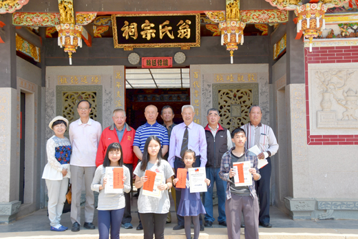 社團法人金門縣金寧鄉盤山村下堡東翁氏二房宗親會昨日於宗祠舉行「清明祭祖」大典,除了以傳統「大三獻」禮祭祀翁氏歷代祖先,藉緬懷祖德宗功,教育子孫應飲水思源,不忘崇祖敬宗的傳統美德,在傳統「吃頭」餐會席間,也由理事長翁國團頒發二房優秀子弟獎學金。明新科技大學教授翁文爐及金門醫院前婦產科醫師翁文堯兄弟昨日也專程返鄉祭祖,同時出席這場二房本家的清明「吃頭」團聚,活動熱鬧溫馨。 值得一提的,從民國99年開始,年年捐款宗親會獎掖後進的該會榮譽理事長翁景進,繼105年起年年捐20萬後,今年第四年他又在宗祠的「吃頭宴」中捐出20萬元予宗親會作為獎學金,翁景進愛在原鄉、回饋桑梓的情懷,也在鄰里間傳為美談。 翁國團指出,翁景進在大陸廣東省東莞經商有成,侍親至孝,平日熱心公益,對社會鄉里的回饋亦從不落人後,民國99年起,他每年於清明或冬至返鄉祭祖時,都會以其母親翁王玉鶴名義捐款予宗親會作為獎學金。99年捐款30,000元、100年80,000元、101年清明120,000元、101年冬至60,000元、102年120,000元、103年120,000元,104年清明150,000元,105年清明200,000元,106年清明200,000元,107年清明200,000元。今年清明節,本於對宗族之熱愛,他再捐出20萬元,累計這幾年,他的捐款總數已將近新台幣一百五十萬元。 翁景進是金寧鄉盤山村下堡東人,目前是東莞裕勝拉鍊五金配件有限公司負責人,該公司是從事尼龍拉鏈、鋅合金壓鑄、手袋五金、箱包五金配件、特殊拉鏈拉頭、防水拉鍊、五金商標、微量商標、塑膠配件、五金配件、五金拉頭等產品專業生產加工的港、澳、台商獨資經營企業,旗下有員工近二百人,除了擁有完整、科學的品質管制體系,該公司也以誠信、實力和產品品質普獲業界的認可。 「吃頭」宴後,盤山村下堡東翁氏裔孫也在翁國團和同樣出身該村落的縣府參議翁自保引領下,齊聚村郊翁氏祖塋祭祖掃墓,期間更搭配熱鬧的摸彩活動,一場載滿「人親土親」的清明節祭祀盛典,也在眾人行禮如儀後掀起活動的熱潮。 除了「吃頭」團聚和祭祖掃墓,下堡東翁氏二房宗親會昨日亦頒發該會108年獎學金暨獎狀,得獎名單如下: 碩士(1名):翁銀霞。 大學(5名)翁瑞駿、翁郁雯、翁語萱、翁偉軒、翁瑋泓。 高中(職)(3名):翁子恒、翁瑞樟、翁明浩。 國中(5名):翁瑀婕、翁莛盛、翁仟靜、翁仟諭、翁于喬。 國小(6名):翁家昕、翁語蓁、翁莛鈞、翁睿煜、翁明維、翁佳如。