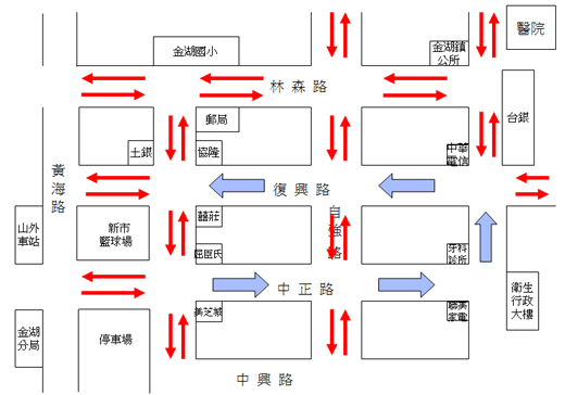 第12屆金湖鎮民代表會日昨召開臨時會,鎮公所觀光課提出「新市街道交通改善計畫」一案,經代表會同意通過,未來將送縣府道安會報討論,通過後便可實施。 本次鎮公所觀光課提案指出,新市里復興路、中正路、林森路等市區街道,近年來車輛流量驟增,違規臨時停車情形日益嚴重,造成來往駕駛人困擾,民眾及本鎮鎮民代表等多方建議檢討回歸單行道之可行性。鎮公所經評估後研擬4個方案,以期改善該區域交通秩序紊亂之問題: 提案1:林森路(郵局至鎮公所)、中正路、復興路(中華電信至協隆商店)設置單行單車道,其餘路段維持現有雙向道。 提案2:中正路、復興路(中華電信至協隆商店)設置單行雙車道,其餘路段維持現有雙向道。 提案3:採行上開提案一或提案二之設置路線,但僅汽車遵循單行道駕駛,機車維持全路段雙向。 提案4:全路段維持現有雙向道,請警察單位於尖峰時段加強取締。 觀光課所提4種選擇,經代表會與鎮長陳文顧討論後,決議實施提案2與提案3,也就是中正路、復興路(中華電信至協隆商店)設置單行雙車道,其餘路段維持現有雙向道(如圖)。且單行道僅用於汽車,機車並不受單行道限制。 鎮公所觀光課針對提案2解釋,將中正路、復興路等較易塞車之縱向路段通車方向由雙向改為單行,並考量當地垃圾車清運路線以及駕駛人行駛路線規劃單行道路線,以增加交通流量,並減少車輛交會及所需空間。另考量林森路上之金湖國小學生上學行走路線空間,因此維持雙向道。 鎮公所觀光課指出,考量旅客可能臨停以及貨車臨時上下貨,因此路肩線主要還是維持黃線。而所有路段只能臨停,針對需久停之車輛則可先至鎮公所後方停車場、金湖國小對面停車場免費停放,如部分居民礙於上述之停車場太遠亦可至菜市場周邊停車場、公車站對面停車場、台銀對面停車場或是直接於路邊之停車格停放,以解決停車問題。