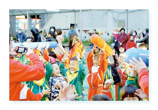 「Let's go party party all night」,金城幼兒園日昨在園內舉辦108級畢業成長活動,在熱鬧歡欣的活動中,學童們迎來人生的第一個畢業活動。 金城幼兒園日昨在園內舉辦108級畢業成長活動,活動內容包含了體能闖關遊戲、自助餐會與營火晚會。園長許碧華表示這是孩子們人生的第一個畢業活動,園內的行政團隊與畢業班老師都希望能帶給孩子一個非常特殊的經驗和難以忘懷的美麗回憶,精心規畫了獨一無二的畢業成長活動,將平常的學習轉化成遊戲並帶些挑戰與趣味;平時用餐的自理能力,透過自助餐的方式可以看到孩子們的成長與獨立性;營火晚會則是希望讓孩子在畢業前夕留下一個美好的回憶。 活動在全體畢業生一起跳「動物派對」、「妖怪手錶」的音樂律動下揭開序幕,接著是有趣又好玩的體能遊戲,遊戲的目的是考驗孩子們肢體動作協調性、小組的合作與班級的默契,並在各班創作的班呼加油聲中,互相加油打氣。遊戲結束後,大家齊聚到活動中心,享用精心安排的自助餐點,並在老師從旁協助下,帶領小朋友體驗不同的用餐方式、學習有別於日常的餐桌禮儀。 活動的高潮是餐會後的營火晚會,在所有畢業班老師進場進行神聖的拜火儀式,氣氛一下子變莊重了,而在園長點燃營火那一刻,也點燃了晚會的高潮,並帶領所有畢業生圍繞著營火一起跳營火舞。現場除了二百多位畢業生,還有許多的家長到場參與自己孩子的畢業成長活動,晚會人潮擠滿了會場。活動在專業的音效與燈光下,讓每班的表演、現場的氣氛更加的熱鬧。晚會在所有畢業生一起牽手合唱「手牽手」畫下了溫馨的句點。
