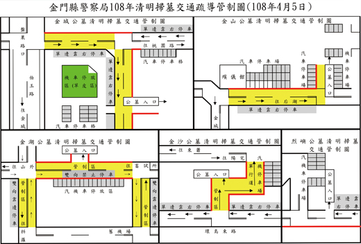 針對清明掃墓祭祖,公墓周邊道路所形成之人潮、車潮,縣警局將於四月五日清明節當天於地區各鄉鎮公墓周邊道路實施交通疏導管制措施,以維人車順暢及安全,並請前往掃墓之民眾及行經該路段之駕駛人配合警方之指揮行駛。 縣警局因應清明掃墓祭祖所可能帶來之人潮、車潮,特指示轄區各分局應作好公墓周邊道路交通指揮管制措施,配合各鄉鎮公所妥善規劃停車格位,於道路寬度許可及不影響行車安全順暢之下,開放道路側邊供民眾單邊停車,以解決前往掃墓民眾停車問題,並視實際需要管制車輛進入或管制單邊通行。 縣警局指出,清明節地區各公墓周邊道路交通管制措施(如圖),分別為: (一)金城公墓:汽機車依現有公墓周邊所劃設之停車格位停放,若停滿後,規劃伯玉路駛來之車輛往公墓側沿盤果路盤山往酒廠方向順向單邊停車至公墓路口;另桃園路口駛往公墓之車輛則由盤果路公墓路口停放至桃園路紅綠燈前10公尺處順向單邊停車;車輛(含汽機車)一律禁止進入公墓墓園區內。 (二)金山公墓:汽機車依現有公墓周邊所劃設之停車格位停放,若停滿之後,規劃由金門酒廠往后湖方向順向單邊停車;車輛(含汽機車)一律禁止進入公墓墓園區內,民眾亦可將車輛停放在殯儀館前停車場內。 (三)金湖公墓:公墓前道路除劃設之停車位外,道路兩側禁止停車,太湖路中正公園至三谿橋路段,以及三多路三谿橋往料羅圓環路段,道路順向停車;車輛(不含機車)禁止進入公墓墓園區內。 (四)金沙公墓:公墓大門前路段為單向通行管制,道路兩側禁止停車,汽機車依現有公墓周邊所劃設之停車格位停放,若停滿之後,因環島東路道路較為狹窄,僅開放該路段陽翟往沙美方向單邊順向停車;車輛(不含機車)一律禁止進入公墓墓園區內。 (五)烈嶼公墓:汽機車依現有公墓周邊所劃設之停車格位停放,若停滿之後,則開放南塘往公墓方向單邊順向停車;車輛(含汽機車)一律禁止進入公墓墓園區內。 慎終追遠、掃墓祭祖表孝思是國人一項重要傳統習俗,每年清明時節前往掃墓者,所形成之人潮、車輛均會影響到周邊道路之行車秩序,因此警方呼籲民眾能多利用大眾運輸工具,並充分配合警方各項交通管制措施,以維交通順暢。
