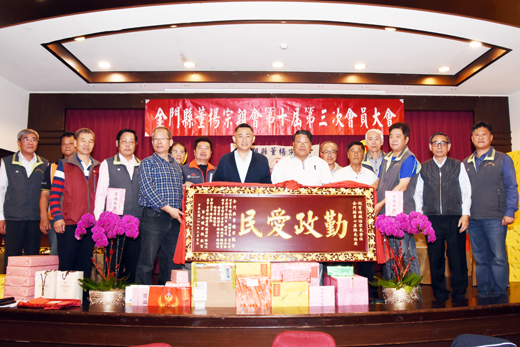 金門縣董楊宗親會昨日中午召開第十屆第三次會員大會並舉行聯誼餐會,董楊童宗親共聚一堂,商討會務,促進宗親情誼,會中除討論全力辦好今年十月下旬在金門舉辦的全球董楊宗親會懇親大會;同時也致贈縣長楊鎮浯「勤政愛民」匾額、鄉長楊忠俊「造福鄉梓」匾額表達祝賀,肯定二位宗長為民服務、光耀宗族。 會員大會於上午十一時三十分許假盈春閣餐廳召開,由理事長楊誠玉主持,全球董楊宗親會理事長楊肅元、縣長楊鎮浯、縣府社會處長董燊、議員楊永立、董森堡及董楊宗親會名譽理事長董國興、前理事長楊誠璽、總幹事楊忠俊及該會理監事與官澳、古崗、湖尾、湖峰、金城等各區宗親會幹部與會員二、三百位出席參加。 縣長楊鎮浯致詞時向大家問好,他也感謝宗親長輩一路走來,對他的疼惜牽成。他說,從宗親會的活動更看出宗親的情感與凝聚力越來越強,在楊誠玉理事長帶領下,宗親會會務蒸蒸日上,總幹事楊忠俊鄉長辦事勤勞,會務打理得井井有條。 楊鎮浯也告訴宗親長輩,有需要他服務的地方,請宗長們交代,做得到的一定全力來配合,他也祝福鄉親長輩身體健康、萬事如意。 理事長楊誠玉感謝大家踴躍的出席參與,並呼籲宗親大家繼續支持縣長楊鎮浯宗長的施政,讓他完成大家付託的任務。他也提到,今年第二十三屆全球董楊宗親會懇親大會將來金門舉辦,希望大家同心協力,有力出力,撥出時間幫忙,總會理事長楊肅元宗長之前也邀集宗親會幹部開過幾次會議,希望宗長們能確實執行負責的任務,讓這次的大會辦得有聲有色。 社會處長董燊也感謝宗親長輩對於縣政工作的支持與期勉,他說,今年十月份全球董楊宗親會將在金門舉行懇親大會,縣府會全力來配合,祝福大家新的一年會務昌隆、宗親們家庭幸福美滿。 昨日會中也進行會務工作報告,討論通過該會一○七年度經費收支表、一○八年度工作計畫書、一○八年度經費收支預算表三案。 在臨時動議時,全球董楊宗親總會理事長楊肅元指出,今年十月二十三日到二十六日,金門董楊童宗親會承辦全球懇親大會,屆時會有來自東南亞新加坡、菲律賓等國以及大陸各地上千位董楊宗長來金門參加,這是金門董楊童宗親會的榮譽,也是金門地區的一件大事,希望到時候各區宗親會能熱心來幫忙,推薦義工、志工,做好接待服務工作,拜託所有宗親務必全力以赴,熱烈踴躍支持,讓懇親大會圓滿成功。 昨日董楊宗親會理事長楊誠玉與會務幹部也代表宗親會致贈楊鎮浯縣長「勤政愛民」匾額、金寧鄉長楊忠俊「造福鄉梓」匾額,表達祝賀與期許。 會員大會後接續舉行聯誼餐會,並穿插摸彩活動,趁著難得的聚會宗親們交流聯絡情誼,氣氛相當熱絡溫馨。