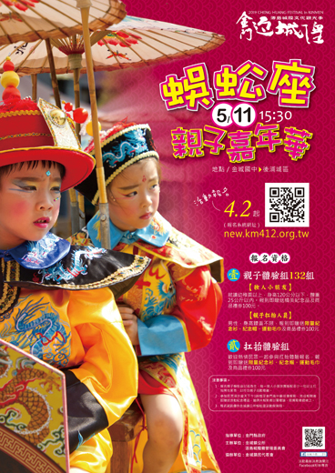 金門年度盛典「迎城隍」即將來臨了,金城鎮公所主辦一項「六十六節蜈蚣座」親子嘉年華活動,將從四月二日的上午九時起開始報名,歡迎親子迎城隍,庇佑保平安。 金門地區年度最盛大的親子同樂活動「蜈蚣座親子嘉年華」活動,將於五月十一日下午舉行遊行,報名將預定從四月二日上午九時起,進行線上開放蜈蚣座妝人小朋友以及扛抬人員報名,歡迎民眾踴躍報名參加,報名網址為:http://new.km412.org.tw,洽詢電話(082)325057,金城鎮公所觀光課。 主辦單位金城鎮公所指出,去年首度舉辦親子蜈蚣座遊行獲得廣泛的迴響,開放報名當天上午妝人小朋友名額就已報名額滿,建國百年時,金門縣以「世界最長純人力肩扛蜈蚣座陣頭」創下金氏世界紀錄,蜈蚣座是金門地區傳統藝陣之一,陣頭出巡有滌蕩邪穢、除惡辟邪之意義,今年是浯島城隍遷治三百三十九年慶典,金城鎮公所選定於五月十一日當天下午舉行蜈蚣座親子嘉年華活動,為即將到臨的四月十二迎城隍活動加溫。 有關妝人小朋友的服裝、化妝,將由鎮公所協請專人協助打理裝扮,名額共一百三十二位,備取二十位小朋友,報名資格為就讀幼兒園以上,身高一百二十公分以下,體重二十五公斤以內的小朋友,金城鎮公所並提醒,小朋友報名還同時須有一名男性成年親友報名參加扛抬人員,鎮公所也歡迎民眾踴躍報名參加扛抬人員。 蜈蚣座活動以親子體驗為主,子女端坐在蜈蚣座上,父親或是叔伯親人一肩扛起蜈蚣座,用呵護、關愛的心情,一步接著一步,走完一段又一段的路,這將是親子間最難忘的回憶,考量蜈蚣座遊行的整體安全及扛抬人員的體力負荷,主辦單位也有限制妝人小朋友的體重上限,遊行路線也將避開城區的狹小巷弄,並且定點停留休息,也大大降低扛抬人員的體力負擔。 蜈蚣座親子嘉年華活動,將於五月十一日下午三時準時出發遊行,參加民眾須記得在活動當天的下午一時前,準時前往金城國中體育館完成報到,逾時未報到者以棄權論,完成報到者也將贈送妝人小朋友文創商品及商品禮券,扛抬人員則為紀念衫乙件及商品禮券。
