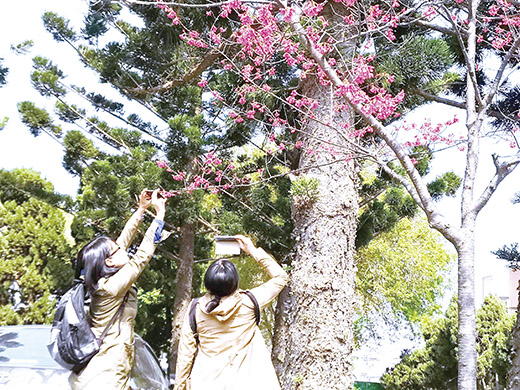 滿樹嬌嫩的紅,乍暖還寒之際在枝頭綻放,春遊的人們隨著鮮豔的花兒,心也跟著染上春天的顏色,腳步也輕鬆了起來,用手機捕捉當季的美景,收藏在名為記憶的匣子裡。
