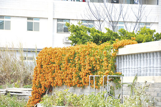 休閒時間,走在鄉村小路,可以看到許多家戶圍牆,種著花團錦簇的爬藤類植物,當開滿橙色花朵綻放,真是賞心悅目。