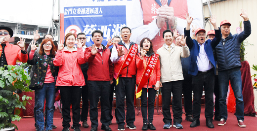 立法委員候選人蔡西湖,昨日上午11時假金湖圓環旁景昇租車行成立競選總部並舉行誓師大會。許久未公開露面的前縣長陳福海、副議長周子傑、金湖鎮代表會主席蔡乃靖、金湖鎮鎮長陳文顧、多位代表及里長和現場眾多鄉親到場搖旗吶喊高喊「凍蒜」。蔡西湖表示,他會牢記鄉親的叮嚀,勤走並傾聽基層的聲音,懇請鄉親支持,讓他有機會到立法院為鄉親發聲,爭取交通、醫療及土地等權益。 立委補選投票日在即,此次號次為3號的候選人蔡西湖,昨日上午金湖圓環旁景昇租車行舉行競選總部成立及誓師大會,現場貴賓雲集,包括,前縣長陳福海、副議長周子傑、議員王秀玉、金湖鎮鎮長陳文顧、金沙鎮鎮長吳有家、烈嶼鄉鄉長洪若珊、金湖鎮代表會主席蔡乃靖、副主席林麗芬、金城鎮代表胡凱宇、金沙鎮代表馬自壯、金門蔡氏宗親會理事長蔡其雍、辛氏宗親會理事長辛寬得、金門區漁會理事長吳安樂、鴻順興海運董事長李文雄、老農莊董事長董水輪等,以及眾多鄉親不畏風雨到場為蔡西湖加油。 活動在北門天震堂祥獅獻瑞、忠義廟電音三太子表演下炒熱氣氛,前縣長陳福海為蔡西湖及夫人董玉芬披掛競選彩帶、金湖鎮代表會主席蔡乃靖致贈好采頭,副議長周子傑授予戰旗;金湖鎮鎮長陳文顧也送上並高舉「粽子」象徵「高中」。與會貴賓登高一呼,大批鄉親到場搖旗吶喊高喊「旗開得勝」、「高票當選」,場面相當熱鬧。 前縣長陳福海鮮少公開露面,昨為蔡西湖站台並感性致詞,讓支持者十分開心。陳福海表示,蔡西湖不論是擔任民意代表或金湖鎮長任內積極向地方以及中央爭取經費,任內不論是交通建設或各項鎮務做出口碑也有目共睹,故此次要向鄉親大力推薦蔡西湖,希望鄉親能多多支持把他送進國會。而自己目前處於沉潛階段,檢討自己過去做得不夠的地方。而過去他在立委任內「公督盟評鑑」第一名,他願意在蔡西湖當選立委後擔任他的助理,一起來為金門打拚。 副議長周子傑也表示,任何事都要靠自己,唯有選舉需要依靠每一位鄉親,所以大家不要輕忽自己的力量。而每一位候選人的當選,鄉親功不可沒,蔡西湖此次如果當選即是鄉親的成功和驕傲。希望鄉親全力支持,把蔡西湖送進立法院,讓金門從金湖出發,金門開始、中央發聲,未來中央、地方一條心,共同為金門打拚。 最後,蔡西湖上台向鄉親懇託指出,投入立委補選以來,他勤走基層,他不會忘記鄉親的叮嚀,也希望鄉親給予支持,讓他帶著在地方基層服務的歷練,到中央為更多鄉親發聲。並特別強調要爭取平反年金改革法案、建議政府對離島地區居民支交通費應給予補助、主張還地於民,重新檢討離島建設條例,以實現土地正義。 另外,蔡西湖也提出五大面向政見,包括,經濟方面,爭取中央編列預算推廣文化產業,爭取成立金廈自貿區,活絡兩岸經貿發展,並且鼓勵青年返鄉創業。醫療方面,建立在地長照平台,獎勵國際企業投資。充實金門醫院醫療團隊。推動金門各學府增設醫學相關系所,與台灣各大醫院進行合作。教育方面,爭取地區學子就讀金門大學保障名額,提供相關補助。推動各鄉鎮嬰幼兒照護,提高生育率。維護校園安全。爭取教育部優先照顧離島學生住宿。 環境上,協調兩岸維護海洋環境,解決海漂汙染問題及建立空污預警防制機制,守護居民健康。推動限縮金門國家公園範圍,配合縣府建設,增加金門開發能量,實現土地正義,推動「還地於民」政策修法。(重新檢討離島建設條例)交通上,監督金門大橋如期如質完工,爭取中央撥款補助,以解決離島交通不便之苦。優化霧季航班疏運機制,爭取各項交通建設補助,照顧偏鄉民眾。
