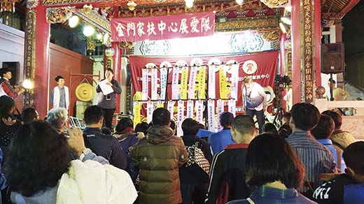 昨(十九)日是一年一度的元宵節,金門各村落社區喜慶洋洋,北門社區發展協會也於下午開始歡慶元宵佳節,另晚間還與金門家扶中心共同合作,在北鎮廟前廣場舉辦「豬歲新景滿元宵」親子猜燈謎活動,現場人潮滿滿,相當熱鬧,呈現濃濃的節慶氛圍。 這項活動由北門社區主辦、金門家扶中心展愛隊承辦、金門酒廠指導的「豬歲新景滿元宵」親子猜燈謎活動,於昨日晚間七時登場,家扶中心今年準備了多達一百道的燈謎謎題,來與現場民眾一起同樂。而北門社區發展協會理事長陳介尊、金門縣政府服務中心主任洪學文等人也特別到場向民眾致意賀節。