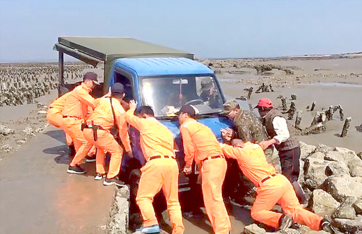 金寧鄉古寧頭李姓村民日昨前往北山蚵田採蚵,貨車打滑深陷蚵架區,一時動彈不得。金門第九岸巡隊第二機動巡邏站副站長中尉吳軒涵等9員及陸軍777觀測所上士王子橋等4員聯手救援,費了九牛二虎之力,協助幫忙當地民眾車輛脫困。 本月十五日中午12時許,古寧頭李姓村民到北山海岸蚵田採蚵,開著小貨車經過蚵田蚵架區時,在出海口W23據點前方灘岸,因石板打滑陷落蚵路旁邊坡,車子傾斜無法移動,不知如何是好。 還好,岸巡南山守望隊第2機動巡邏站及時發現,由第二機動巡邏站同仁抵達現場協助處理,並聯繫陸軍777觀測所同仁協助幫忙搬運,上士王子橋等4員抵達協助幫忙搬運受困小貨卡,但因車輛太重又遭石塊卡住,10餘分鐘後才順利脫困。 古寧村長李開陣特別感謝守望隊與國軍弟兄幫忙解困,也為地方再添一段軍愛民佳話。