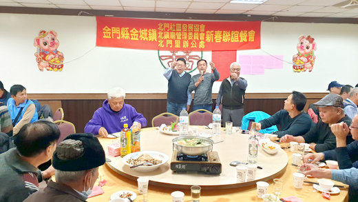 金城鎮北門社區發展協會召開笫五屆第二次會員代表大會,會後同時舉辦北鎮廟管理委員會、北門社區聯合新春聯誼餐會,與社區民眾一同慶賀新春,各界貴賓也先後到場祝賀,並向現場民眾拜晚年。 北門社區發展協會昨(十六)日召開第五屆第二次會員大會,會議由理事長陳介尊主持,協會理監事及會員代表出席,會中討論今(一○八)年度的工作計劃以及去(一○七)年度的收支決算、一○八年收支預算及會務以及財務報告,會後並與北鎮廟、里辦公處舉辦新春聯誼餐會,餐會氣氛融合,賓主盡歡。 餐會過程中,金門縣政府社會處長董燊代表縣府到場致意,金城鎮長李誠智、金城代表會主席陳天成、副主席蘇碧浯、代表林金英、李錫瑜、縣府服務中心主任洪學文等也前往恭賀,而立委參選人陳滄江、蔡西湖、洪麗萍等,也由本人或是派出代表到場,向民眾拜年,並爭取支持。 對於各界貴賓的到訪,也受到北門社區理事長陳介尊,北鎮廟管委會主任委員傅啟澤,北門里長許績才以及會員的熱烈歡迎。三人也一一逐桌向里民們敬酒話家常,現場氣氛充滿新年的歡愉氣氛。