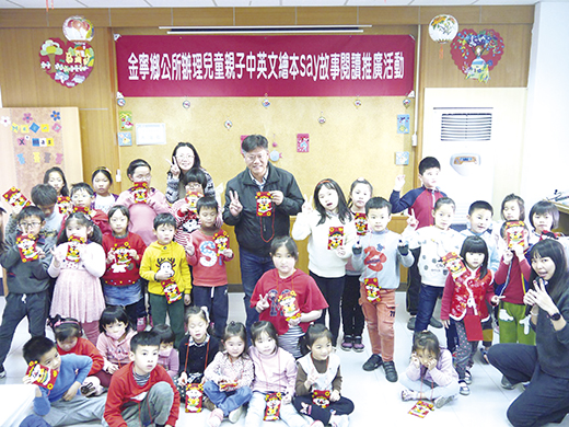 一項由金寧鄉公所主辦、金寧鄉圖書館承辦的兒童中英文繪本Say故事閱讀推廣研習活動告一段落。金寧鄉長楊忠俊主持結業式時感謝老師每次都帶給小朋友不一樣的教學方式,大家獲益良多。也期盼透過英文故事生動的演說及話劇,引起小朋友對英文閱讀樂趣,藉閱讀增加兒童知識,促進學習成長,獲得興趣,豐富生活。並鼓勵小朋友持續學習英語,從小就能扎下基礎英語的學習能力,來提升自己的英語能力。 這項由金寧鄉公所主辦、金寧鄉圖書館承辦的兒童中英文繪本Say故事研習活動,一連四天假金寧鄉圖書館辦理四場次,金寧地區幼兒班以上至3年級親子計二百多人參加。活動課程採多元及生動活潑的學習方式進行,聘請美語老師楊淑珍及洪翎郡指導中英文繪本帶動唱,美語會話、表演美語話劇、有獎徵答、美語說故事等。 活動也安排手作實用又環保財神爺紅包袋,小朋友獨自製作紅包袋,老師和家長在一旁協助完成,現場放著恭喜發財的歌曲相當應景,過新年時小朋友們可以開心拿著紅包袋向家人賀節。 四天的中英文繪本故事告一段落後舉行結業儀式,由金寧鄉長楊忠俊主持,他表示,鄉公所開辦兒童假期英語研習目的,在鼓勵學區內的小朋友學習英語,培養第二種語言能力;研習上課期間,小朋友均認真跟著老師學習,奠下良好的英語學習基礎。 楊忠俊指出,英文是國際上最通用的語言,也是最多人想學習的國際語言,而且商業、財經、科學、教育、政治、外交和電腦程式語言等很多領域都使用英文作為共用語言,學習英文是很重要,以往是國中階段才開始學習英語課程,處於國際化的社會,現在已經向下延伸至小學就開始學習英文,圖書館利用假期辦理研習營,最主要還是希望透過活動,激起學童學習的興趣,也豐富學童的暑期生活。楊忠俊鼓勵小朋友學語言就是要敢開口,多說、多講,不斷訓練自己的聽說能力,更重要的要能不間斷的學習,才能提升自己的語文能力,為未來的人生奠下基礎。