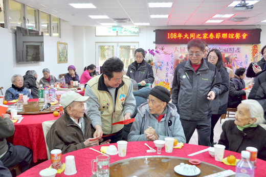 金門縣大同之家昨天舉辦歡度一○八年春節聯誼餐會活動,金門縣議會議長洪允典伉儷、議員李養生及議會秘書長甯國平、會計主任汪秋明、祕書朱國華等主管一同參與同樂。同時,洪允典並致贈加菜金及祝賀新春快樂,受到大同之家主任楊志斌及長者熱烈歡迎,場面洋溢著溫馨氣氛。 農曆己亥金豬年春節即將到來,在大年除夕家人團聚圍爐吃年夜飯,是許多人不管再忙也要趕回家相聚的溫暖時刻,更是老人家們期盼的兒孫團圓時刻。因此,為了讓大同之家的長者們感受團圓慶新年氣氛,議長洪允典特別於昨日中午陪著長輩們一起坐在餐桌前吃團圓飯,看到長輩們臉上掛著滿足的笑容倍感幸福。 洪允典溫馨提醒大家多多關心身邊的家人與需要幫助的弱勢長輩,希望藉此愛心關懷活動,能喚起社會重視老人、尊敬老人的價值,為因應高齡社會所帶來的人口老化、老人安養、勞動力減少等衝擊,更希望大家以「在地人服務在地人」理念,讓鄉親一同來守護弱勢長輩、照顧更多長者。 此外,昨天和大同之家的長輩圍爐慶佳節、溫馨過好年,議長洪允典祝福大同之家的長輩們不只呷百二,大家都能更健康高壽,也祝福長輩未來一年快快樂樂;整個春節聯誼餐會在歡樂融融的氣氛裡,劃下圓滿的句點,提前過一個歡樂佳節的美好時光及迎接新年。