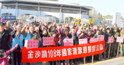 響應「國家清潔週」,金沙鎮昨日上午在鎮長吳有家率領下,軍、民、學子共計350人於上午八時三十分齊聚金沙鎮公所前誓師,並隨即展開環境清潔工作,一個上午時間共清除1.5噸垃圾。 鎮長吳有家表示,感謝軍民學子自發性地參與此次環境清潔工作,希望藉以呼籲鄉親不分你我一起從生活中做起,落實環境保護,清潔家園,讓我們共同擁有一個整潔乾淨又美麗的金沙。 昨日與會的單位在誓師後,兵分多路展開鎮轄清掃街道、各個社區和學校周邊環境,鎮長吳有家也和軍民學子一起撿拾菸蒂等垃圾,並清除公共環境中的枯枝落葉,還給社區、景點、街道等公共空間整潔環境。金沙鎮公所也籲請鄉親,加強清理戶內、戶外環境,清除易積水容器,加強排水溝清掃,以避免媒蚊孳生,同時消滅蚊蠅、蟲鼠等。此外,也落實垃圾減量以及分類於生活之中,共同維持公共環境之整潔,營造美麗舒適之生活環境。 昨日參與金沙鎮「國家清潔週」誓師活動的單位包括,金門守備大隊、金門國家公園、金門岸巡隊、金沙鎮環保志工、婦聯青溪金沙支分會、金沙國小、各社區發展協會等,為期一個上午共清除1.5噸垃圾,其中包括,15公斤的塑膠袋以及1.2公斤的煙蒂。 金沙鎮鎮長吳有家指出,感謝社區居民、學子、轄區駐軍一同投入環境清潔工作,為維護街道市容整潔而共盡心力,也展現軍民一家的友好情誼。希望鄉親除了於年節前做好居家環境整潔外,也能自發性維持公共環境之整潔,讓你我用行動從自身出發,打造乾淨美觀整潔的金沙。