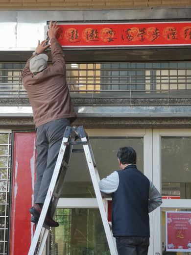 詹宗翰╱圖文 「千門萬戶瞳瞳日,總把新桃換舊符」,張貼了一年的春聯,經歷風吹日曬雨淋,多數已褪色剝落,文化局的三副春聯也在歲末換上新的好迎接新年。 細心地把春聯的邊角自壁上揭起,再慢慢的剝離,「喜歡貼在門楹上的字,趁著換新的時候,把舊春聯揭回家收藏」,爬上梯子小心翼翼地揭下舊春聯,就怕一個不小心撕破了,邊作業著邊打趣地說「弄破損時就只好撿著完好的字拼湊了,像『小處不可隨便』那樣」。 揭下舊春聯後,趕著新春聯貼上前,文化局把門面洗刷一番,在農曆年前的最後幾天上班日,好好的除舊佈新,迎接己亥年的來到。