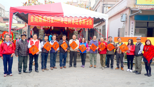 再過兩周左右的時間,就即將踏入農曆豬年了,日前在南門天后宮前廣場,一場熱熱鬧鬧的「金城鎮南門里一○八年迎新春送春聯」活動盛大展開,由於正好是星期假日,因此現場湧入滿滿的人潮,除了索取書法家們的墨寶之外,現場的宣導攤位排滿民眾,等著闖關拿獎品。 這場由南門里公所主辦,金城鎮公所、南門社區發展協會、南門天后宮、金門縣美術學會共同協辦的「金城鎮南門里一○八年迎新春送春聯」活動,日前於南門天后宮前廣場舉辦。一早九點開始,現場便熱鬧滾滾,金門縣政府民政處長陳世保、金城鎮長李誠智、金城鎮民代表會主席陳天成、代表倪于媃、陳子芸、南門社區發展協會理事長邱嘉樹、南門里長鄭易岳、南門天后宮主委許燕輝、金水里長黃延良等人,也到場向民眾拜早年。 鎮長李誠智表示,隨著新年的時間越來越近,年節的氣氛也逐漸的變濃了,他肯定南門里舉辦迎春的活動,讓大家在假日期間能有個出來活動的好去處,李誠智並向現場民眾拜早年。 民政處長陳世保、主席陳天成、主委許燕輝等人也一一向民眾祝賀佳節,並預祝民眾在金豬年可以心想事成。 這項活動是由南門里主辦,里長鄭易岳表示,為了活絡過年的年節氣氛,同時也傳承中華文化,弘揚書法國粹,並宣導民俗文化教育,今年特別規劃迎春送春聯的活動,此次與金門縣美術學會合作,特別邀請到唐敏達、謝華東、莊火練、吳鼎仁、呂光浯、王振昌、盛松俊等人現場揮毫,並將這些春聯贈送給鄉親,讓大家來除舊布新,為家中換上新氣象,此外,也會準備春聯贈予轄區內獨居長輩與中低收入戶。 現場還有多個機關,像是金門縣政府政風處、金門縣就業服務中心、金門縣衛生局、金門縣婦女服務福利中心、社會福利服務中心、金門家扶中心等多個單位到場設攤宣導,吸引民眾排隊了解相關政策內容及領取實用宣導禮品,而主辦單位還規劃套圈圈、猜猜樂、神射手等趣味遊戲,以及小朋友書法體驗區,讓大小朋友玩得相當開心。另擲筊得好禮的活動,同樣是讓大家躍躍欲試。
