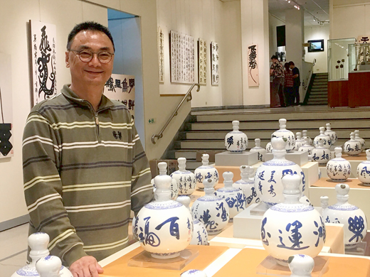 「藝游未盡—蕭世瓊華甲書藝展」於台中文化局大墩藝廊展出中,展出以「瓶」安「酒」久系列主題酒器共有129件,是蕭世瓊三度來金門,以金門縣陶瓷廠生產的酒瓶用青花釉藥創作燒製後,並灌裝(三公升)金門酒廠窖藏五年陳年高粱酒。相同的酒器不同的書寫風格和青花圖騰,讓官窯所產製的瓷瓶更顯優雅及獨特。金門縣陶瓷廠表示,名家、名瓷、名酒結合的三名,是文創商品的表徵,透過異質結合創造出火花,充分行銷文化金門! 書法家蕭世瓊,在地區書法協會洪松柏昆仲及理事長吳宗陵引薦下,因緣際會三度在金門縣陶瓷廠創作,1月12日假台中市大墩文化中心推出「藝游未盡—蕭世瓊華甲書藝展」,內容以「瓶」安「酒」久系列主題酒器為主,129件作品即是蕭世瓊三度抵金利用金門官窯所產製的瓷瓶並灌裝金門高粱酒的作品,每件作品中可以看見他將青花圖騰結合書法藝術變幻創作,這也展現他鍥而不捨地嘗試跨界合作,並讓書法藝術成功地融入到生活之中。 金門縣陶瓷廠表示,蕭世瓊在此次展出「瓶」安「酒」久系列主題酒器共有129件,蕭世瓊三度來金門,用陶瓷廠生產的酒瓶上,透過青花釉藥創作燒製後,由金門酒廠灌裝窖藏三公升五年陳年高粱酒。每一個酒器雖然形制相同,但書寫風格及文字內容各異,白瓷青花,典雅精緻,每一個都是獨一無二的。 蕭世瓊邁入60歲,再度以「古典主義的現代書法」概念,創作似畫非畫,讓人驚嘆連連的書藝作品外,也鍥而不捨地嘗試,透過各種跨界結合讓書法成功融入生活之中。此次,蕭世瓊以「藝游未盡」作為六十歲展覽的主題,希望未來更加淬礪,十年之後,或許能脫胎換骨,有另一番風貌。 金門縣陶瓷廠表示,「藝游未盡—蕭世瓊華甲書藝展」是一個試金石,名家、名瓷、名酒、結合的三名,是文創商品的表徵,透過異質結合創造出的火花,充分行銷文化金門。同時也將藝術陶瓷引領至另一層次,讓更多人透過展覽認識金門、有助於品牌行銷。而107年亦有多組藝術名家到陶瓷廠創作,包括,榮獲國際廿世紀藝術貢獻獎勳章殊榮的(中國美術協會理事長)王愷率領中華藝遊協會會員等18人。高齡八十九歲書畫家舒曾子、前海軍總司令陳邦治、將軍書法家吳國勝、山東曲阜大學教授王步強博士等皆曾到廠創作。金門縣書法協會著手引薦國內更多著名書畫家來金,共同行銷文化金門。