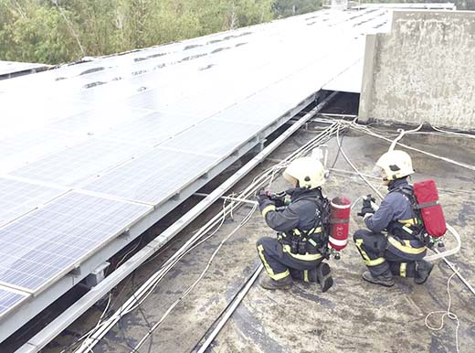 為落實罕見的太陽能板火警事故搶救,金門縣消防局責成基層分隊熟悉太陽能板火警如何救災,金寧消防分隊特前往裝有「陽光屋頂」太陽能板的金寧中小學教學大樓演練太陽能光電系統搶救,避免消防員感電和能快速撲滅火警演練,期能藉由平時落實訓練,使第一線救災人員掌握搶救重點,強化救災安全及提升搶救效能。 金寧消防分隊依據「太陽光發電設備安裝場所救災安全演練計畫」於金寧中小學教學大樓辦理搶救演練,並邀請發電機組設置廠商之技術士針對此種設備進行現場講解,清楚說明電力設備的危險因子及排除的方法,保障救災人員安全。 金寧消防分隊表示,整體流程係依據消防署函頒之「消防機關搶救太陽光電發電設備火災指導原則」規劃,確實掌握以下要點:(一)斷電後,太陽能板與變流器(inverter)間配線仍有電力,火場搶救人員作業時須著完整防護裝備器材,並避免碰觸導電物體。(二)勿貿然射水,滅火行動盡可能使用乾粉或氣體藥劑;若需射水,在6至10公尺以上之距離處,以展開角度30度以上之水霧射水,且瞄子出水壓力至少7kgf/cm2。(三)注意建築物斜屋頂及外牆太陽能板碎片掉落危險。(四)非必要時勿碰觸、破壞太陽光電發電設備,以免觸電。消防局第一大隊大隊長陳國瑋指出,本縣設置太陽能發電設備場所共計145處,其中裝置容量超過100瓩之大型發電場所共計處13處,有些甚至隱藏於民宅之中,未來將持續針對是類高危險因子場所辦理搶救演練,使第一線救災人員掌握搶救重點,強化救災安全及提升搶救效能。 消防局局長楊肅凱表示,近年建築物設置太陽能發電設備蔚為趨勢,面對此一新型態電氣設備,期能藉由平時落實訓練,並精進消防人員裝備器材使用,提升救災能力,以確保民眾生命財產安全。