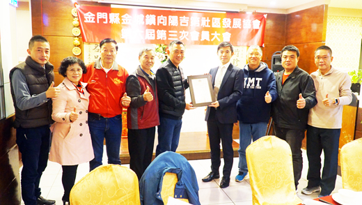金城鎮向陽吉第社區發展協會日前舉辦第六屆第三次會員大會暨聯誼餐會,邀請社區成員們一起聯歡,並在農曆新年之前聯絡彼此情誼。會中,理事長楊肅謙為了感謝前任鎮長石兆瑉與前里長盧志嶢任內對社區的照顧與建設,特別致贈感謝狀。 向陽吉第社區發展協會第六屆第三次會員大會暨聯誼餐會,於日前晚間六時三十分起,在葡京餐廳舉行,縣長楊鎮浯、金城鎮長李誠智、金城鎮代表會主席陳天成、財政處長孫國智、國民黨金門縣黨部主委林芳旋、議員石永城、前議長洪麗萍、前議員陳玉珍、金沙國中校長黃明森等人,也先後前往致意,並且向社區民眾道賀,拜早年。 感謝各界貴賓的共襄盛舉,向陽吉第社區發展協會理事長楊肅謙也向社區民眾們拜早年,楊肅謙表示,去年十月份開始動土的社區活動中心,是在前任鎮長石兆瑉的推動下,以及時任議員的李誠智、議長洪麗萍等多位議員的配合款協助下,才得以順利開工動土。 李誠智表示,樂見社區活動中心可以順利動土,他上任之後了解到目前活動中心面臨到原有岩盤的問題,他也會和相關單位來共同研討,希望能在不影響進度的原則下,盡快讓活動中心落成啟用,造福社區民眾。 縣長楊鎮浯說,社區最重要的就是居民之間和諧,他肯定向陽吉第社區的民眾們彼此之間情誼深厚,這也表示社區發展協會發揮很好的功能,楊鎮浯除了感謝民眾的支持之外,若社區在發展建設上有任何需要協助之處,縣府與鎮公所方面都相當樂意來協助。 昨日會員大會,同為社區住戶的陳金福特別捐贈兩萬元,用於社區志工隊服裝用途,社區特別致贈感謝狀表達謝意。另社區也特別製作感謝匾額,謝謝已卸任的鎮長石兆瑉與賢庵里長盧志嶢任內的辛勞,及對社區的幫忙。