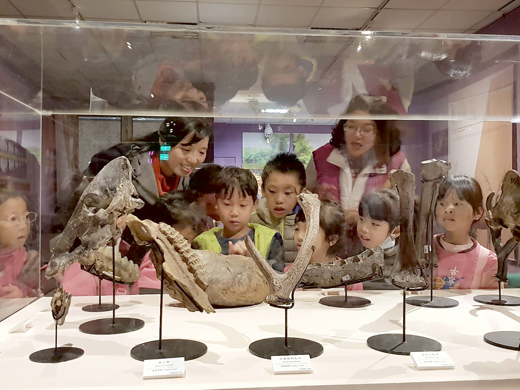 「哇,恐龍!」一進文化局大廳,小朋友的目光就被展場入口巨大的華陽龍吸引,好不容易在帶隊老師的約束下稍稍安靜。古寧國小日昨(14日)由校長黃芸芸帶領全校學生到文化局參觀古生物特展,讓全校學童近距離的感受史前巨獸的魅力。 古寧國小依教育部「美感教育參訪縣內藝文館所計畫」辦理活動,將全校同學帶到文化局、古寧頭戰史館、瓊林等地參觀,希望藉以提升學童美感視野,增進文化理解與涵養,以及提升學生鑑賞能力與興趣。古寧國小特地在學期結束之前,趕著古生物特展在文化局展出時,帶領全校學生134人、及教職員工26人,分批的到文化局等地參觀。 主辦單位台灣博物館貼心的為觀展的學童設計學習單,希望小朋友不只是參觀一個展覽,更能在參觀過程中學習到一些東西,不只課堂可以學習到知識,到文化展演場所或是戶外參訪也能有不同的體驗。15題的問題設計,囊括展覽的部分重點,不是認真的看展的話,恐怕還答不上來。 小朋友在志工的導覽下,從地球生成,到生物的五大滅絕事件,上了一堂豐富的生物及地球史。小朋友對於展場的骨骸標本展現高度的興趣,臉幾乎貼到櫃子上,只為了瞧得更清楚,也興奮的在模擬化石挖掘的體驗區,一個勁的用刷子撥開骨骸上頭的覆蓋物。 為了對這一大批的國小及幼兒園學童導覽,文化局志工一大早也幹勁滿滿的準備,甚至拿起手機複習放到Youtube上的影音課程。文化局在開展前二天請專家為志工們上課,雖然時間倉促,不少志工仍是努力地將講師所教的,依模畫樣的在觀展民眾面前表述出來。有志工表示,文化局難得有如此能吸引大量觀展民眾的大型展覽,希望藉由這次活動,讓文化局日後在規劃活動時能有更周詳的考慮,讓民眾更樂意走進文化局或文化園區。