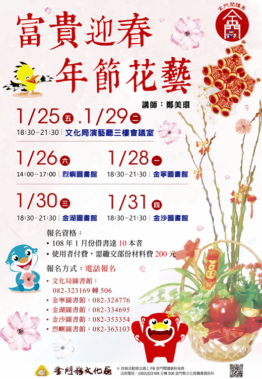 農曆春節將屆,金門縣文化局辦理金門閱讀島「富貴迎春年節花藝」閱讀推廣活動,自即日起於各鄉鎮圖書館上班時間(星期二至星期日上午9:00至17:30)受理電話報名,額滿為止。 文化局表示,凡於一○八年一月借書達十本者(以圖書館系統查詢借閱資料為主)皆可參加,歡迎全縣符合資格之民眾報名參加活動;基於受益者付費觀念,參與民眾需自付部份材料費二百元,並請於電話報名後最晚在1月18日前下午五點前完成繳費,繳費地點請至報名的各鄉鎮圖書館櫃檯。 活動共有六場次,舉辦時間及地點訂在:01月25日18:30~21:30假金門縣文化局演藝廳三樓會議室辦理;01月26日14:00~17:00假烈嶼圖書館辦理;01月28日18:30~21:30假金寧圖書館辦理;01月29日18:30~21:30假金門縣文化局演藝廳三樓會議室辦理;01月30日18:30~21:30假金湖圖書館辦理;01月31日18:30~21:30假金沙圖書館辦理。每梯次各招收四十人,並請參與活動者提前二十分鐘報到。 文化局場報名專線:082-323169轉506;烈嶼場報名專線:082-363103;金寧場報名專線:082-324776;金湖場報名專線:082-334695;金沙場報名專線:082-353354每通電話限報4位名額。 「富貴迎春年節花藝」活動將邀請鄭美環老師傳授插花技巧,這次提籃盆栽組合DIY花藝教學活動,以長春藤、長壽花、鳳梨花、好彩頭、妝飾鞭炮、妝飾元寶、妝飾花束及蝴蝶結為主要材料,經過改造組合之後成為有創意的花藝盆栽組合,與年節十分應景。 插花是一種藝術手法,以植物的枝、葉、果實、甚至路邊的小花都可以利用盆栽、竹籃甚至不要的瓶子都可以表現出生活藝術,插花派別主要分為日式、傳統西式、英美式等;各派別又有其各自的特色,文化局為了讓參加活動的民眾能學以致用,所以鼓勵民眾至各圖書館借閱插花藝術相關書籍,了解插花相關知識,活動詳情請上金門閱讀島FB。