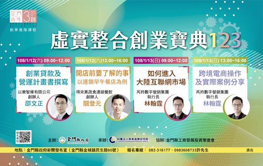 金門青年三創服務平台為提升青年創業之實力,將於本月12日至13日上午9時至下午4時,在金門縣政府新聞發布室,與金門縣工商發展投資策進會共同舉辦「創業進階課程-虛實整合x創業寶典123」共計2天4堂系列課程,報名網址:https://goo.gl/forms/8O4g7UdYSEfd9t082或電話報名專線:082-316177。 縣府建設處表示,金門青年三創服務平台自去年8月14日正式啟動營運起,每月定期舉辦創業相關課程,截至今日止已辦理9場創業課程,辦理期間廣受青年好評。近日將首次辦理「密集型創業進階課程」,請來三位輔導青年創業具豐富經驗業師,傳授創業必備武功密笈,經由實務經驗與案例分享,協助青年朋友有效提升創業實力。 「創業進階課程-虛實整合x創業寶典123」系列課程分別為:108年1月12日上午9時至12時「創業貸款及營運計畫書撰寫」,邀請前行政院新創基地營運長、以樂智庫有限公司創辦人邵文正先生,分享創業第一步要先找尋政府提供的創業資源和營運所需的資金籌措與計畫書撰寫;當日下午1時至4時,辦理主題則為「開店前要了解的事-以連鎖早午餐為例」,邀請全台第一家素食早餐連鎖店-得來素蔬食連鎖餐飲創辦人關登元先生,分享從一台行動餐車創業,到至今已擁有全台19家連鎖素食店面的心路歷程,與青年朋友分享創業前需評估的市場定位與價值、營業結構之解析及財務預估和基礎數位行銷應用。 1月13日上午9時至12時與下午1時至4時則辦理上、下午共兩場次,邀請在市場營銷、電商、數據產品,跨足時尚、家居、O2O等垂直電商領域的國際化團隊-芮羚數字營銷集團執行長林翰霆,來分享電商概念及電商實務。上午場次辦理主題為:「如何進入大陸互聯網市場」,將從電商定義與世界趨勢,分享B2C、C2C、C2B、B2B等五大電商模式,以及跨境電子商務與全球市場的變化;下午場次辦理主題為:「跨境電商操作及實際案例分享」,將以電商企業組織怎麼做?如何建置金流與物流、電子商務生態成員與企業組織架構、金流與物流?以及微信、支付寶等實際操作。 縣府建設處亦提醒,課程上課時間為108年1月12日至13日,計兩天四堂課,因名額有限,敬請各界與會學員自行選擇要上課時段,事先線上或電話報名參加,報名網址:(https://goo.gl/forms/8O4g7UdYSEfd9t082)或撥打報名專線(082-316177、0983608733)許先生,更多訊息歡迎搜尋官方網站:金門青年三創服務平台(官方網址:http://youthhub.kinmen.gov.tw/)、臉書:金門青年三創服務平台,以及Line好友:@kod4743g。
