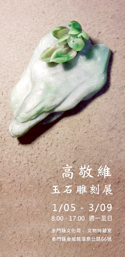 「上下四方謂之宇,古往今來謂之宙。」由金門縣文化局邀請了國內知名的玉石雕刻藝術家高敬維前來金門展覽。高敬維將每一件玉石當作一個小宇宙來創作,依礦石天然的造型與紋理,雕琢出其深藏之意涵,從繁出簡、筆刀雙運的創作出一個個的玉雕。「高敬維玉石雕刻展—宇宙觀」,自一月五日起至三月九日止,展出於文化局文物特藏室,歡迎大家參觀寓大於小的藝術。 高敬維出生於台灣宜蘭,十四歲上台北半工半讀,學習雕刻書畫,廿五年後移居好山好水的花蓮,從事玉石雕刻書畫的藝術創作,長達四十餘年,為台灣極具代表性的玉雕家。 高敬維除了各國玉石雕刻之外,還專精珊瑚、貝殼、牙類、石刻,更有豐富的水墨畫創作,因此在他的雕刻作品中,彷彿能感受到水墨畫的空靈與留白的詩意,以及筆刀雙運的趣味,是極為難得多元創作的藝術家。 高敬維的創作靈感,源自於長年研究地球文化,以及在大自然中體悟、淬鍊所養成,作品內涵與宇宙天地相互呼應,四十五年創作過程中,不斷創造出具時代代表性的作品,訴說著台灣的故事、刻畫出悟道者的神韻,作品中更散發修行人獨有的禪意,展現宇宙觀的創作理念,蘊育昇華獨特的風格,創造出屬於自己的一套雕刻系統及藝術理念。 高敬維是金門的女婿,這次能夠回家鄉展覽,感到十分的榮幸和開心,特別帶了歷年創作的精采玉雕作品,在金門文化局的文物特藏室有兩個多月的展覽,展期自一月五日起至三月九日止,「高敬維玉石雕刻展—宇宙觀」,歡迎大家前去參觀體驗!