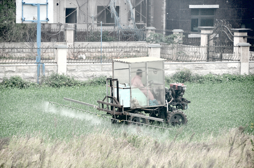 李增汪/圖文 現在正是小麥成長時期,農友趁著好天氣以機械化方式,實施噴灑農藥,提前預防小麥因病蟲害危害生長,這樣的景象成為田野特殊的景觀。