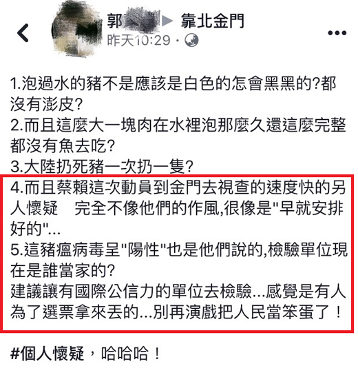 中國大陸海漂「非洲豬瘟」豬屍事件,一名郭姓網友在臉書社團「靠北金門」發文暗指「非洲豬瘟豬屍是『有人為了選票拿來丟的』」,質疑海漂死豬是政府自導自演,言論被其他網友向農委會防檢局檢舉,防檢局表示此番言論已明顯違反《動物傳染病防治條例》第43條,將依法追究,最高可罰100萬。 一名郭姓網友在5日上午10:29於金門知名臉書社團「靠北金門」發表文章,質疑「泡過水的豬不是應該是白色的怎會黑黑的?都沒有澎皮?」、「而且這麼大一塊肉在水裡泡那麼久還這麼完整都沒有魚去吃?」、「大陸扔死豬一次扔一隻?」。 郭姓網友甚至意有所指地暗示,「蔡(蔡英文)賴(賴清德)這次動員到金門去視查的速度快的另人懷疑,完全不像他們的作風,很像是『早就安排好的』」、「這豬瘟病毒呈『陽性』也是他們說的,檢驗單位現在是誰當家的?」、「建議讓有國際公信力的單位去檢驗,感覺是有人為了選票拿來丟的,別再演戲把人民當笨蛋了!」 此番言論被其他網友轉載至台灣其他臉書社團,有網友並截圖向農委會防檢局檢舉。農委會防檢局第一時間在臉書回應表示,「防疫不能開玩笑,請不要散播不實謠言,有網友指涉金門發現的海漂死豬是政府自導自演,農委會嚴正駁斥該不實訊息,並強烈譴責散佈不實訊息的網友,農委會防檢局一定依法追究」。 農委會防檢局隨即也在官方網站發布正式新聞稿指出,民主的言論自由非常珍貴,但也不應恣意妄為,網友言論不僅完全違反事實,且嚴重打擊全體防疫人員的努力,行為已經明顯違反《動物傳染病防治條例》第43條,農委會除將依法追究外,也呼籲大家共同抵制這種造謠的行為,並持續支持配合政府的防疫作為,以保護台灣豬隻產業與國人享用國產安心豬肉的權益。 農委會昨日中午在台召開記者會,防檢局長馮海東表示,針對有網友散布不實說法,後續會蒐證追究法律責任,包含依照《社維法》提告,另依照《動物傳染病防治條例》也會開出罰鍰。農委會副主委黃金城表示,首例在金門金沙鎮發現、確診非洲豬瘟海漂死豬,地點距離對岸泉州市金井鎮僅4公里,加上現吹東北季風,一吹就過來了,且這案例是由海巡署在巡防時發現,並且經過國家實驗室檢驗,「這種不理性陳述,一定會採取法律行動處理」。 根據《動物傳染病防治條例》第43條規定:「有下列情形之一者,處新臺幣5萬元以上100萬元以下罰鍰:…(中略)…三、散布有關動物傳染病流行疫情之謠言或傳播不實之流行疫情消息。…(後略)…」