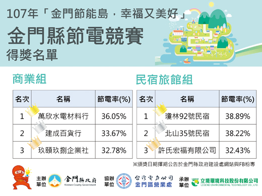 107年金門縣節電比賽結果揭曉,萬欣水電及瓊林92號民宿,分別以節電率36.05%及38.89%,各抱走10萬元大獎。 縣府建設處指出,這項由金門縣政府和經濟部攜手共同推動、為期三年的「縣市共推住商節電計畫」,以強化民眾節電觀念,促進住宅、服務業、機關等部門持續節電為宗旨,期間陸續推出的各項節電活動,包括:「設備汰換與智慧用電補助」、「金門縣節電小尖兵」繪畫比賽、「節電志工培訓課程」、成立「住商節電推動小組」等等一系列的規劃及各項宣導。 縣府建設處表示,本次商業及旅宿業節電競賽,分為商業組及民宿旅館組,與自己去年同期用電度數比較,平均節電率最高者為勝;各組取前三名,第一名獲得新台幣10萬元獎金及獎狀,第二名獲得新台幣8萬元獎金及獎狀,第三名獲得新台幣4萬元獎金及獎狀。 商業組得獎名單如下:第一名「萬欣水電材料行」,與去年同期相比節電率約36.05%;第二名「建成百貨行」,與去年同期相比節電率約33.67%;第三名「玖頤玖捌企業社」,與去年同期相比節電率約32.78%。 民宿旅館組得獎名單如下: 第一名「瓊林92號民宿」,與去年同期相比節電率約38.89%;第二名「北山35號民宿」,與去年同期相比節電率約38.22%;第三名「許氏宏福有限公司」,與去年同期相比節電率約32.43%。 縣府建設處表示,此次藉與服務業合作,一起來發揮自身的影響力與創意,除了共同參與這個有意義的節電任務外,更要作為金門的節電尖兵,時時刻刻守護珍貴的電力資源,從本身身體力行做起,並留給後代子孫一個永續發展的環境,共同實現「金門節能島‧幸福又美好」的目標。 頒獎日期將擇期公告於金門縣政府建設處網站(http://ead.kinmen.gov.tw/),及FB臉書「金門節能島‧幸福又美好」。如有任何疑問可撥打服務專線: 321635,會有專人為您說明。
