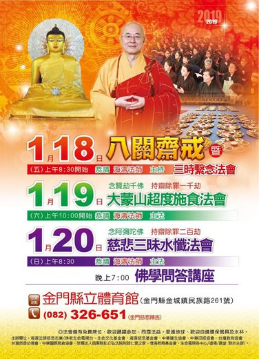 金門慈悲精舍將邀請生命電視台台長-海濤法師抵金弘法,於本(元)月17日前往金門監獄辦理「心靈講座」、18日至20日於金城體育館辦理消災祈福法會、佛學講座等,歡迎大眾踴躍參與、同霑法益。聯絡電話:082-326651。 祈願世界和平、無災難戰爭、風調雨順、國泰民安、社會祥和、人民安居樂業、經濟繁榮,海濤法師慈悲志業金門慈悲精舍,特邀請生命電視台台長-海濤法師,於17日抵金展開為期4日之弘法行程。 海濤法師金門弘法行程安排,分別為: 17日(四)下午2時30分,於金門監獄舉辦「心靈講座」。 18日(五)上午8時30分,於金城體育館舉辦「八關齋戒、三時繫念法會」。 19日(六)上午10時,於金城體育館舉辦「大蒙山超度施食法會」。 20日(日)上午8時30分,於金城體育館舉辦「慈悲三昧水懺法會」。20日(日)晚上7時,於金城體育館舉辦「佛學問答講座」。 金門慈悲精舍指出,法會備有免費消災,超薦牌位供大眾填寫,免費墮胎嬰靈超渡申請牌位,歡迎大眾踴躍參與、同霑法義、同證菩提、同成佛道。愛護地球,也請前往參加者歡迎自備環保餐具及水杯。