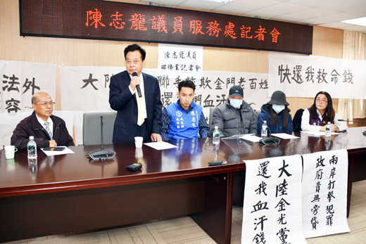 大陸金光黨來金犯案!金門地區一位李姓民眾遭到來金的魏姓大陸人士等4人設局詐騙新臺幣250萬元,他除向警方報案也向新科議員陳志龍陳請協助,昨日並於議會召開記者會,希望能協助追回血汗錢。縣警局極度重視本案,目前該案已函報刑事警察局循兩岸共同打擊犯罪機制接續偵辦。議長洪允典指出,他與議員同仁會盡最大的努力來協助。而陳志龍議員今(29)日也將陪同受害人前往廈門市公安局報案追緝犯嫌。 李姓被害人與家屬是在議員陳志龍與姊姊陳玉珍的陪同下在議會行政大樓二樓會議室召開記者會,議長洪允典、議員李養生、前議員林孫全及議事主任陳勵志、總務主任陳祥麟出席參加,也邀請案發地點金湖分局分局長張文峰列席說明。 退休後以種菜為生的66歲李姓民眾於本(12)月13日上午8時20分許在金湖鎮山外,遇到1名男子以請求幫忙搬東西為由搭訕,他不疑有他慨伸援手,因此踏進金光黨布下的陷阱。 接著同黨二號、三號人物分別以說客、新加坡富商角色出現,並以藏頭露尾的「高科技產品」為誘餌,製造高價低賣的騙局,取得李男信任,誘騙李男合資做買賣,並由一名黨羽緊盯著他回家取存摺再去金城的銀行提款。 途中這名金光黨的手突然拂過李男的頭,以類似催眠的手法,說了一句「你要發財了」。李男毫無警覺地提取250萬元退休養老金迷迷糊糊地交給金光黨歹徒,等他回過神,才發現鉅款換來的「高科技產品」竟是一袋普通的維他命C,歹徒已不知去向,他立即向金湖分局金湖派出所報案,希望能協助要回血汗錢。 金湖分局分局長張文峰指出,李姓被害人是於13日上午11時5分至該分局金湖派出所報案,員警受理後為被害人製作筆錄,同時展開調查,經調閱監視器追蹤查證,發現當天上午9時59分李姓被害人至土地銀行金門分行領新臺幣250萬元,犯嫌魏○○等4人得手後,10時51分搭計程車A離去,於上午11時進入機場,犯嫌4人進入機場內後,旋即出門於11時02分搭乘計程車B離去,警方循線追查發現計程車B於11時15分載往金城西海路「向陽吉第」下車後,旋即隨手攔計程車C往水頭方向,犯嫌4人於11時30分分別買票,搭乘中午12時往廈門的小三通航班「馬可波羅」離境。 張文峰指出,犯嫌刻意製造斷點,混淆警方偵辦方向,金湖分局於接獲被害民眾報案後,第一時間立即通知南區國境事務大隊金門事務隊駐檢攔查,該分局並已依違反刑法詐欺罪及組織犯罪防制條例移請金門地檢署偵辦,並向內政部移民署申請實施境管,並函報刑事警察局針對跨境犯罪部分接續偵辦。 陳志龍議員指出,這個犯罪集團利用我們金門老百姓的善良及金門小三通的便利,進行這麼有組織的犯罪,非常令人遺憾。兩岸關係密不可分的今天,任何民間的接觸所衍生之問題,都需要雙方公部門即時聯手面對問題、解決問題。他呼籲兩岸政府應從速捐棄成見,真心誠意聯手處理各種糾紛,才不致造成受害民眾求訴無門。而在地民眾應警覺此類犯罪行為,記取教訓,避免再遭金光黨肆虐。他也決定今(29)日陪同受害人赴廈門市公安局報案追緝犯嫌。 議長洪允典指出,兩岸打擊犯罪中央政府十幾年前就開始努力,但是因為兩岸沒有共識,這令人感到遺憾,對於這個案子,他與議員同仁會盡最大的努力來協助。 他也表示,兩岸打擊犯罪非常重要,尤其現在交通往來頻繁,中國大陸這幾年詐騙集團猖獗,這是我們應該要防範的地方,也請警察單位多注意人流方面治安問題,而鄉親也要提高警覺,以免被騙。 議員李養生指出,金門在改變時代,面對的是中國大陸,各種情況隨時都會發生,呼籲中央重視金門這項議題,修法賦予金門更多功能,才能及時有效防患未然。 陳玉珍指出,希望透過媒體的披露報導,讓金門民眾知道,提高鄉親的警覺性,使詐騙集團無法在金門繼續猖獗。