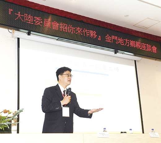 大陸委員會與國立金門大學昨日共同舉辦「大陸委員會 招你來作夥」地方鄉親座談會,與會人員關注小三通、海漂垃圾、中國大陸漁船越界抽砂、漁業資源保護、陸客觀光等議題。陸委會副主委邱垂正強調,兩岸政策一直都是民眾關切之議題,政府向來十分關注離島民眾的權益,持續與地方鄉親溝通、凝聚共識,務實解決問題。 「招你來作夥」座談會,昨日上午十時假金門大學陳開蓉會議廳舉行,由陸委會副主委邱垂正、金門大學校長陳建民共同主持,中央相關部會官員列席。金門縣議員李應文、新科議員董森堡、前議長王水彰、民意代表、工商社團負責人、媒體及青年學子等各界人士到場關心議題。現場互動及提問情形熱烈,並進行廣泛的意見交換。 金大校長陳建民指出,金門很多大小事務都和大陸事務息息相關,兩岸關係和政策方向,都會影響金門的發展。陳建民說,金門得天獨厚的地理環境,兩岸政策在金門做緩衝,小三通啟動後帶給金門一片榮景,金門當地鄉親希望兩岸政策有所再突破,包括,一日遊、落地簽等符合地方發展的需求。 陳建民也談及金大招收陸生議題,他表示,金門大學有四千五百多位學生,兩百一十位是外籍生,一百六十八位是陸生,這幾年,陸生來台學士名額減少,金大也從每年招收七十二位陸生縮減到去年十六位,希望陸委會和教育部能同意金大單獨招生,放寬陸生名額,每一年如果可以招收200位到250位陸生,四年就有一千位陸生在金門就學、生活和消費,可以助益金門當地經濟。 副主委邱垂正與中央相關部會代表針對民意代表、工商業者提出的問題當場答覆,並建立對話管道,以便後續聯絡處理。 邱垂正說,陸委會會持續傾聽金門當地民眾的心聲及意見,加強保障民眾福祉。他並強調,為金門的未來發展,政府一定會群策群力、未雨綢繆,做好萬全的準備,當金門鄉親堅強的後盾。 中國非洲豬瘟疫情嚴重,台灣全面警戒非洲豬瘟入侵,金大校長陳建民建議相關單位要持續加強向民眾、旅客宣導防疫措施,共同來防堵病毒入侵。 陸委會副主委邱垂正指出,中國大陸非洲豬瘟疫情持續蔓延,機場端,金門等與中國往來的小三通管道,是政府防疫工作的重點。各地機場、碼頭皆加強防疫措施及宣導作業,遏止疫情傳入台灣、金門。邱垂正表示,為全力防範非洲豬瘟自境外傳入,依據「海峽兩岸農產品檢疫檢驗合作協議 」,應即時通報對方並積極溝通協調處理,且有賴雙方彼此合作、共謀解決方法,希冀中國大陸應共同遵守協議,攜手防範非洲豬瘟,讓兩岸能少點政治、多辦正事,回歸到正常軌道,創造人民最大的福祉。