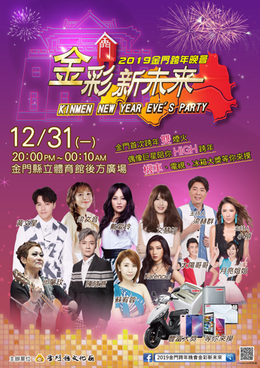 一年一度的金門跨年晚會將於二○一八年十二月卅一日晚上七點三十分在金門縣立體育館後方廣場舉行,由金門縣文化局主辦的二○一九年金門跨年晚會「金彩新未來」,是專屬於金門人的跨年盛事。這次不同以往,打造歷年最強煙火秀、超強卡司偶像巨星陪你HIGH跨年、大型LED彩幕炫麗璀璨秀、高規格硬體團隊、超值大獎等,都在今年二○一九金門跨年晚會隆重登場。 這次金門縣文化局徵選出在地團體的三組頂尖表演團隊,登上跨年大舞台,一展巨星般的光芒,讓在地民眾也能與巨星一同站上舞台。除了有好聽的饗宴,另外在地優質店家也徵選十組,在跨年演唱會活動現場設攤展售,除了讓現場民眾欣賞精采節目以及優質聽覺效果之外,更能推廣金門特色美食,活絡在地經濟效益。 今年也特別邀請國內知名廠商施放煙火,首創六百秒雙煙火秀,分別兩次施放,第一次於晚間八點施放兩分鐘,第二次在凌晨整點施放八分鐘,華麗雙煙火秀,只有在今年! 地表最強硬體團隊,以「金彩新未來」為主題,搭配多元硬體配置增加舞台氣勢,讓今年晚會精彩絕倫;此外,今年邀請到超強卡司的表演藝人,不管是國語、台語、民歌還是創作歌手,還有小朋友最愛的東森YOYO太陽哥哥和月亮姐姐,應有盡有,超強節目加上最優質的主持人,還有摸彩送好禮,將會在跨年晚會過程中一一抽出幸運兒,而今年大獎好禮是機車一台! 除此之外,在跨年當天,來自廈門以及中國的朋友們,凡持有廈門到金門的船票或是入境機票(船票要一個禮拜內才有效,日期要為十二月廿五日至十二月卅一日期間),即可參加金門縣文化局舉辦的二○一九金門跨年晚會的特別獎抽獎活動。當天會在倒數完的壓軸時間,特別抽出三位幸運的觀眾朋友,可獲得金門縣文化局頒發的一錢重的金牌獎,呼籲對岸的同胞多多來參與這次優質的活動!