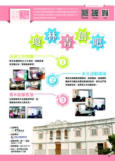 金門青年三創服務平台日前在瓊林青創吧舉辦「創業小聚年終歡聚會」活動,邀請「瓊林青創吧」空間借用者及在地青年共同參與,期望凝聚青年力量,互相發言交流自己的創業歷程及想法,促進青年朋友彼此從中學習。 這場活動也是「瓊林青創吧」今年度最後一場活動,以「瓊林青創吧」空間借用者為主角,由四位空間借用者出席與在場的青年創業家及學生分享創業心得,出席者有來自教育、旅遊、民宿、影像、廣告、餐飲、文創……等不同領域業者聚集在一起,共同大談創業、就業及未來合作的契機。 縣府竭誠歡迎青年朋友到金門青年三創服務平台所設立兩處實體據點了解:創業基地-瓊林青創吧(金湖鎮瓊林70-3號)、一站式諮詢服務據點-後浦給問樓(金城鎮莒光路112號),更多諮詢服務、活動、課程、講座資訊詳情也歡迎洽青年三創服務專線(082-316177)、網頁搜尋:金門青年三創服務平台(官方網址:http://youthhub.kinmen.gov.tw/),臉書搜尋:金門青年三創服務平台,Line好友搜尋:@kod4743g。