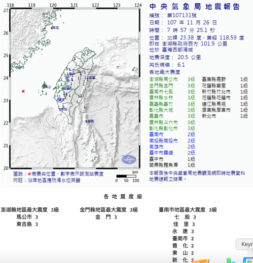 昨(二十六)日上午金門突然發生地牛翻身,經中央氣象局測得金門為三級地震,罕見的狀況也讓許多民眾議論紛紛,不少長年生活在金門的長輩們都表示:「從來沒有這樣的經驗」。而搖晃約10幾秒的時間,所幸沒有任何災情發生,亦沒有人員受傷。 地區昨日上午約在七時五十七分左右發生有感地震,該時間正好是大家上班時間,不少已經抵達辦公室的民眾,都有感受到明顯的搖晃,因此嚇壞不少人。根據中央氣象局的資料顯示,發生時間是昨日上午七時五十七分,位置在北緯二十三點三八度、東經一一八點五九度,是在台灣西部海域,澎湖縣政府西方約一百零一點九公里處,地震深度二十點五公里;測得震度為芮氏規模六點一。 而數據資料顯示,震央周邊測縣市鄉鎮測得震度,最大以澎湖縣馬公市、金門縣、台南市七股、雲林縣水林、嘉義縣義竹、彰化縣大城、嘉義市、雲林縣斗六市、彰化縣彰化市等地區,為三級震度。 金門為花崗岩盤,同時甚少有地震發生,因此昨日地震令不少民眾恐慌,不少長輩們都說,他們在金門生活這麼多年,首次感受到這麼明顯的地震,就連二十多年前的九二一大地震,當年金門搖晃的感覺也沒有這麼強烈,所以昨日的地震可說是地區史上最有感的一次地震了。 由於地震發生時間正值上班時間,因此許多還在家民眾,都可明顯看到吊燈激烈晃動,家中櫃子玻璃碰撞也被震得響亮,還有民眾說感到頭暈不舒服;而已到辦公室的人也同樣感受到地板房屋明顯晃動,直呼可怕。 另根據金門氣象站的說法,其實昨天的三級地震並非金門首次,金門氣象站設站以來,過去就有三次測得芮氏規模三級的地震,另外還有一次是在二○○八年的五月十四日,當時測得規模則是四級。