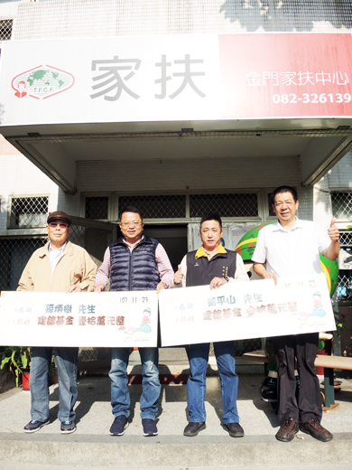 金門家扶中心扶幼館建館動土消息傳出後,金門鄉親孫炳樹及黃平山於日昨連袂前往家扶中心捐贈扶幼館建館基金,幫助家扶中心興建兒童扶幼館。孫炳樹先生捐贈十萬元、黃平山先生捐助三十萬元,由金門家扶中心扶幼主委李根遠代表金門家扶中心接受此筆善款,並公開感謝兩位捐款人的善行義舉。 孫炳樹與黃平山有20年左右之情誼,可謂「忘年之交」,經常聚首笑談人生分享生命經驗。孫炳樹先生表示:因在黃平山先生之工作地點,知道家扶中心50年來才蓋一棟屬於自己的兒童扶幼館,因此連袂相約來到家扶中心貢獻自己的一份力量,並拋磚引玉邀請鄉親共同來做有意義的事。孫炳樹先生幼時家中手足繁密,家中生活清苦,皆是胼手胝足縮衣節食擠出生活費用,且八名弟妹們都需要他協助看顧,因此特別能感受到弱勢家庭的無助,因此義無反顧捐助金門家扶中心來庇護弱勢家庭及兒童。 黃平山先生目前擔任金門高職家長會會長,平時關心金門地區的教育工作,熱心參與學校事務不遺餘力。黃平山表示,家庭是培育兒童成長的搖籃,如果家庭功能不彰,在學校就會產生問題再來就是病發於社會。因此只要在金門地區不僅是教育工作,弱勢家庭的照顧和社區事務的參與都是他關心的項目,希望把老一輩金門的傳統優良文化維持保存下來。 金門家扶中心李桂平主任表示,感謝孫炳樹及黃平山兩位善心人士,猶如社會的清流砥柱般造福地方弱勢族群,讓金門家扶中心扶幼館的完成邁進一大步。金門家扶扶幼館購地建館總經費約計8500餘萬元,目前籌措已將近一半的經費,期盼金門鄉親們能奔相走告,把金門家扶扶幼館建館消息傳播出去,無論在地鄉親或者是旅居台灣的金門子弟,甚至僑居南洋的金門裔親友,把愛傳出去成就金門弱勢家庭及兒童的疼惜照顧工作。