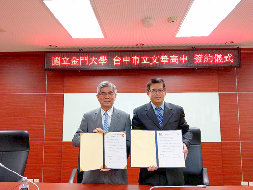 為強化特色科研主題學習成果,金大校長陳建民與台中文華高中校長何富財日前共同簽訂學生交流合作協議書,未來將針對台中文華高中師生在各類科研專題製作與地方特色研究上給予協助與指導。 陳建民表示,金大除與中國大陸多所知名大學建立姐妹校合作關係之外,更設有各類交換計劃、短期研習等方案,提供學生到對岸中企或台企實習的機會。 陳建民強調,由於金門地理位置特殊,金門早期即有大量移民移居東亞各地,金門鄉親、僑親遍佈日、韓及東南亞各國,與金門有著血濃於水的緊密連結,而這些海外「金僑」對於金門大學更是鼎力相助。而金門大學與東南亞各國的學術交流也十分緊密,如此優異的條件使得金門大學儼然成為新南向的重要基地。 何富財表示,該校為實現十二年國民教育基本課綱「跨領域素養課程」及響應政府新南向政策,期望能落實以學生為主體的課程設計,並培養學生跨領域的學習能力,對此文華高中於近年來積極的推動各項特色課程及校本位課程來實現該理想,未來更計劃開設「兩岸關係與聚焦東亞」、「環境生態保育」等相關課程。因此殷切地期望能仰仗金門大學專業且優秀的學術背景、優異的地理位置及金門地區濃厚的人文、歷史背景,開啟文華學生的視野,並透過金大的指導使學生能深究兩岸議題,並進一步了解東亞與世界接軌。 文華高中教務主任魏秀蘭也表示,除新型態課程設計外,該校目前已開設多年「府城採借、中區文化再造」課程,是以台中在地為核心帶領學生以國內外別具風味的城市做為學習及比較的對象,目前除帶領學生以「台南府城」、台北「大稻埕」為研究比較的標的外,未來更期望能在以「集全台閩南建築之冠」的金門做為學習及研究的對象,拓展學生的學習領域。