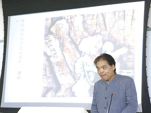 由金門書法學會主辦的王步強師生刻字藝術展,刻正假燕南書院展出作品。日前邀請王步強至金門大學華語文學系,和大家分享刻字藝術的觀念及作品。王步強,中國大陸山東曲阜師範大學書法學院副院長,兼中國書法家協會刻字硬筆委員會委員、山東省書法家協會副秘書長、理事、刻字硬筆委員會副主任。 王步強首先對中國文字做一系統地介紹,他強調中國書法藝術是中華文化經典寶庫的最重要的一個部分,書法承載了整個中華文明的記載、發展。從書法的發展史來看,可以找到幾個規律,其一,「書刻印」,由掌握文字的人進行書寫、雕刻,代表文人的最高水平,所以才會被傳承,當成字帖臨寫;其二,自書自刻的人皆為當時的貴族,最有文化和掌握文化的人,其文章書寫及雕刻;其三,發揚經典,如四書五經或是好的字帖,唐太宗時即廣傳王羲之的蘭亭序。 王步強指陳「自書自刻」就是刻字藝術的根本,並在演說中對中國文字的發展作一概述,他指出因為自書自刻,所以才能進行臨摹、傳承,繼而進行創作、發展。文字有造字規律,由六書—象形、指事、會意、形聲、轉注、假借來理解造字法,所以可從眾多不可識的金文中統整出其書寫規範及格式,知道上頭書寫了些什麼。他也表示印章為傳承文字的管道之一,古代官方還設機構管理,培養人才;眾多的石經也是在官方的主導下,將經典傳承廣布。 王步強指出各種書體是獨立的,之間是相發、相容、相合的,他表示在形成小篆之前,其實已有隸書,稱之為「隸變」,同時期的書寫若過草、符號概括化,之後就發展成草書,寫得過於方折,之後就演化成楷書,所以各書體可謂是同時誕生的,隸、楷、行、草四體幾乎是同時誕生的多胞胎。他認為每個人有適合的書體和字帖,找到適合自己的書體才能迸出火花,才有可能成為書法家。 王步強在課堂上表示,字帖的根源在刻字,如甲骨文、青銅銘文、碑刻,之後才為人所學習、複製。唐宋之後書寫和刻字分野,刻字只是照著字跡刻,沒能有進一步的創作。而自書自刻傳到日本後,一九六○年代將理念傳到了韓國,一九八○年代才又傳回中國,引起中國反思何以日韓在這方面領先中國,經中國書法家學會努力了三十年,才又讓中國重回刻字藝術領域的龍頭。 王步強表示,現代刻字藝術生長在傳統刻字藝術之上,加以融合美術、設計、雕刻、裝飾,把一切藝術有利的元素都變成創作者的語言。他也為眾人展示了幾幅作品,表示刻字藝術乃通過巧妙的構思來解答一個創意,具有詩人般的思維和意境。他統整中國現代刻字藝術的特點如下:注重主題創意、強調立體空間構成、注重刀法肌理之美、注重色彩的感情處理、注重裝飾之美、強調書法高度。因此在作品上,可看出創作者的用心,賦予一個作品複數的意義。王步強希望將刻字藝術自金門大學傳播開來,他勉勵在座的學生傳承發揚經典,在弄懂之後,去糟粕而存續之,才能使人類文明高度發展。