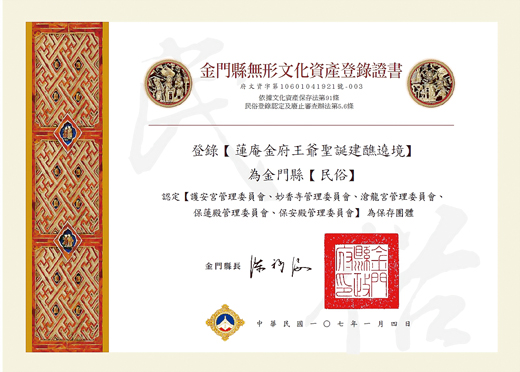 位於金湖鎮蓮庵里的五呂聚落,每年於金王爺聖誕聯境建醮慶祝並出巡鎮營,由庵邊、土樓、東村、西埔、西村等五個呂姓聚落,輪番舉辦活動,今年的「蓮庵五呂金府王爺聖誕建醮遶境」將於11月24日至25日一連舉行兩天,24日早上九點邀請縣長陳福海親自頒發民俗保存證書,歡迎善男信女到場觀禮,來一趟民俗活動之旅。 這項活動在民國35年稱為「蓮庵村慶神聯鄉會」,該慶神聯鄉活動是「過東五呂」金王爺聖誕聯境建醮一年一度的重要慶典,目的在藉由聯境合祀出巡活動,以聯絡五呂宗誼,結合偏鄉眾力,保佑闔境平安,維護家邦。 活動緣起是在抗戰勝利後,鄉紳呂邦禎倡議所有呂氏聚落宮廟主神聯境合祀,以連絡宗誼。當時五呂中庵邊奉祀的金王爺香火鼎盛,有乩身起駕顯聖,故以庵邊金王爺為共同信仰主神,輪流奉祀。後因故庵邊迎回金王爺,其他聚落因而各塑金王爺金身在自鄉宮廟供奉,五呂再另塑一尊金王爺金身共同輪祀。起初是以擲筊方式決定輪流順序,即西村>庵邊>土樓>東村>西埔,一年一替,五年一個循環,且必須有戲班演出後才能交辦。自1946年開始,然於1948年受到戰亂影響停辦,到1970年戰地政務時期申請獲淮,並請到戲班,才回復舉辦這項慶神聯境合祀活動迄今。 今(107)年1月由金門縣文化局公告登錄為金門縣無形文化資產民俗項目,並經庵邊護安宮管理委員會、土樓保安殿管理委員會、東村滄龍宮管理委員會、西埔妙香寺管理委員會、西村保蓮殿管理委員會等五個委員會通過將活動定名為「蓮庵五呂金府王爺聖誕建醮遶境」,受到政府的重視和維護。依據文化部文化資產法「民俗登錄認定及廢止審查辦法」,主管機關應就民俗保存者頒授證書,今年活動適逢金王爺原鄉庵邊負責舉辦,配合活動辦理,金門縣文化局特將於11月24日早上九點遶境出發前,邀請由縣長陳福海親自頒發保存證書予五個委員會。活動也將延請澄清靖混元壇陳梅濤法師設建醮,並邀請各聚落宮廟主神與會,共襄盛舉,活動將透過法師淨鼓儀式後「起鼓」,依程序巡安繞境,營鎮五鄉,完成一年一度的五呂聯鄉金王爺聖誕慶神活動,屆時將可預期熱鬧的盛況,歡迎善男信女到場觀禮,來一趟民俗活動之旅。