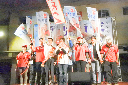 金沙鎮鎮長候選人吳有家,昨晚假金沙戲院前舉辦造勢晚會,現場沒有大陣仗的貴賓站台推薦,吳有家率服務團隊向鄉親懇託,在社區舞蹈團隊及鄉親熱情相挺下,同樣熱鬧滾滾。吳有家的女兒吳雨桐以感人的懇託,讓晚會又歡喜又溫馨。吳有家告訴鄉親,當選後除了照顧老、幼,也要申請撥用特色營區,輔導建構青創中心,並且要爭取建置金沙鎮大型綜合館,更要編列預算發放旅遊消費券,活絡金沙鎮經濟。 金沙戲院連日來相當熱鬧。昨日晚間六時許,金沙鎮鎮長候選人吳有家辦理造勢晚會,社區才藝團隊輪番登台,更在主持人吳伯揚(金城鎮鎮長候選人)情義相挺主持助陣下,帶來一波又一波的歡樂氣氛。6時30分許,吳有家率領競選團隊進場,鄉親熱情歡迎,比出「YA」的勝利手勢並高喊凍蒜,為活動再掀一波高潮。 吳有家訴說參選的九項政見,除了要活化經濟、活化營區建置青創中心,也要整合資源以里為中心建構老人供餐和關懷據點。並積極爭取二歲以下托育(已於107年4月13日正式提案),並要重新啟動沙美市場、金沙戲院、沙美老街、大佛園區、港口碼頭、合宜住宅、官澳海堤內灣之規劃與追蹤,每半年跟鄉親報告進度。此外,他更要打造一個親民、便民、主動、積極的服務團隊。 晚會中途,縣長陳福海、副縣長吳成典、金沙鎮代表會主席王秀玉、議員李應文也到場參與。陳福海、吳成典先後獲邀上台肯定吳有家從政12年來的表現,也細數縣政府近年來為金沙在各方面投入的建設及未來發展規劃。期盼鄉親支持吳有家,也給他和縣府團隊一個機會,讓政策延續。 最後,吳有家的太太張愛容,女兒吳雨桐也懇請鄉親給吳有家一個服務的機會。吳有家也率領競選團隊再次登場,他謝謝鄉親到場參與,也懇請大家把他送進金沙鎮公所,為大家服務,並引領團隊下台向鄉親獻唱感恩的心致意,也讓晚會在歡樂又溫馨的氣氛中畫下完美句點。